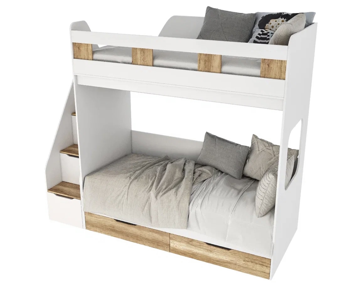 спальное место для двоих, навесная полка для книг и игрушек, вместительные выдвижные ящики под кроватью, а также безопасная лестница расположенная сбоку, обеспечивающая быстрый и удобный доступ на второй этаж, с безопасными ступенями в виде выдвижных ящиков.