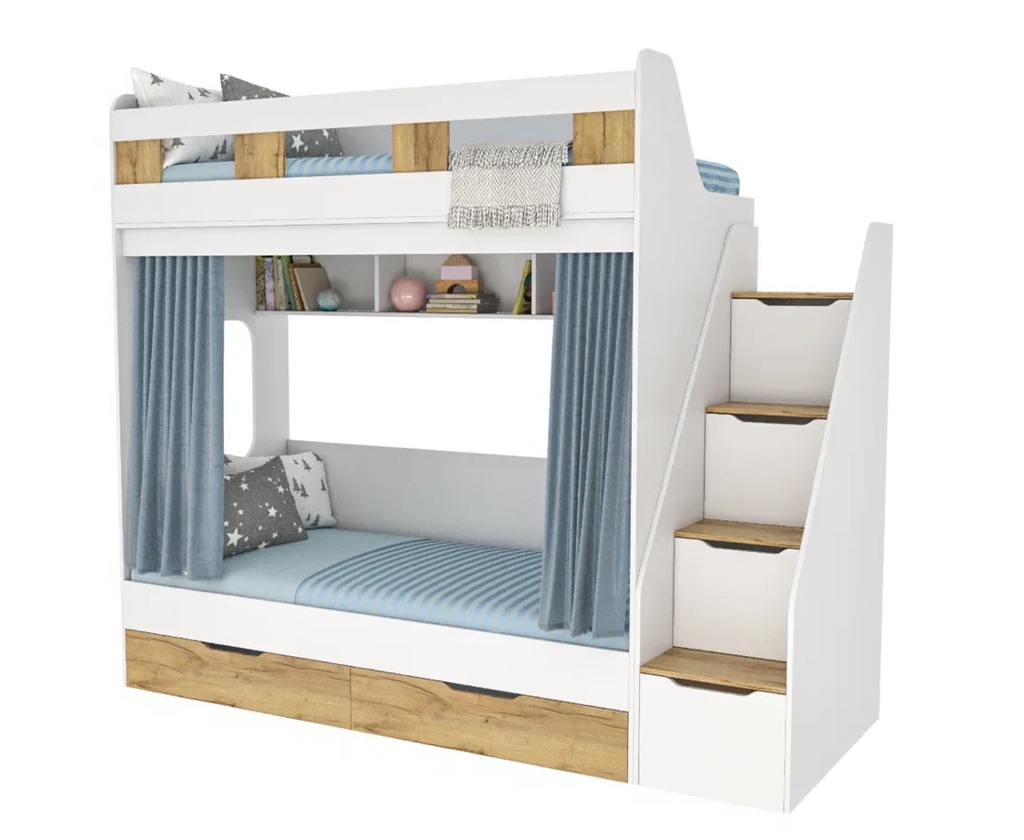 Прочная, стильная двухъярусная кровать Твинс с удобной лестницей, безопасным высоким бортиком и ящиками для хранения.