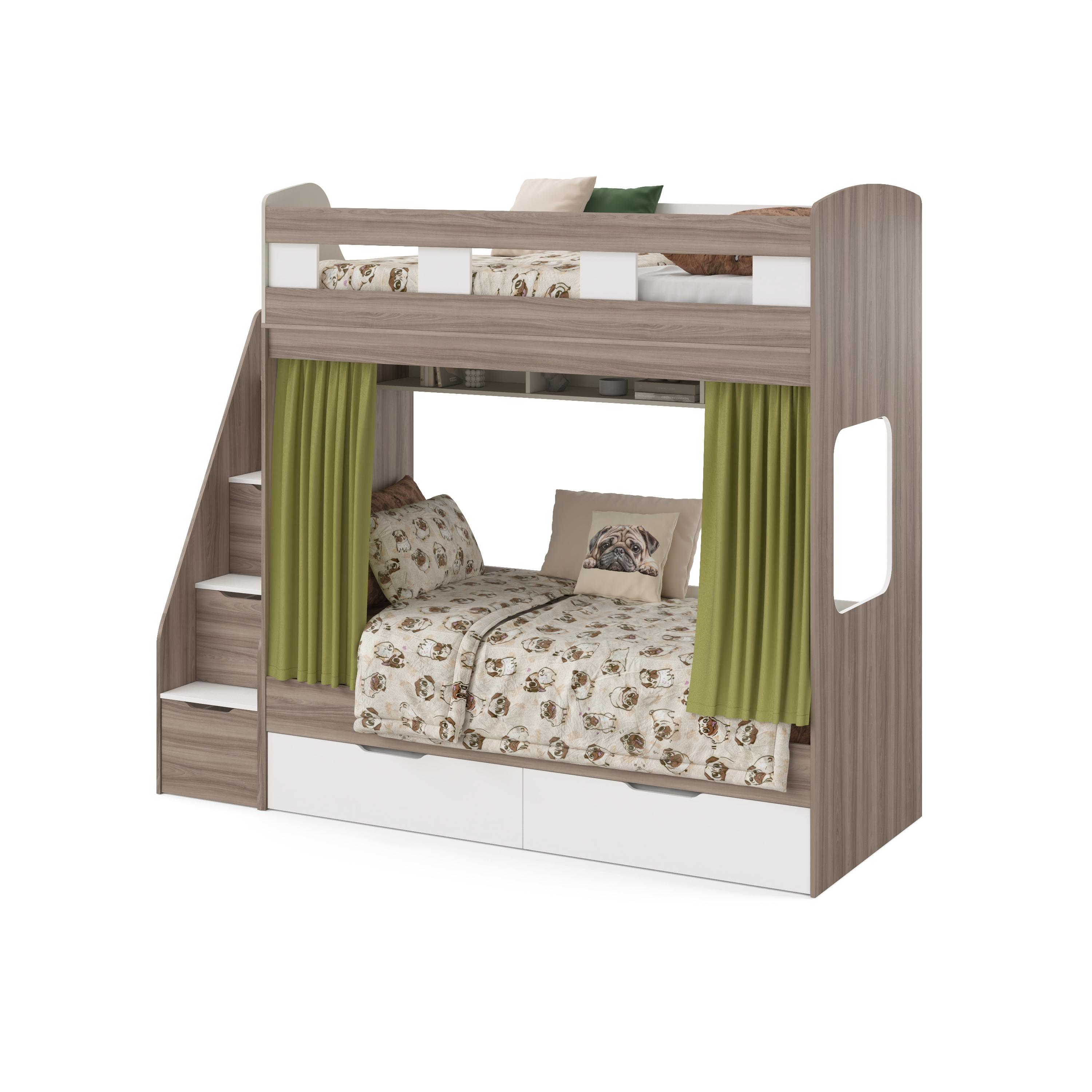 Прочная, стильная двухъярусная кровать Твинс с удобной лестницей, безопасным высоким бортиком и ящиками для хранения.