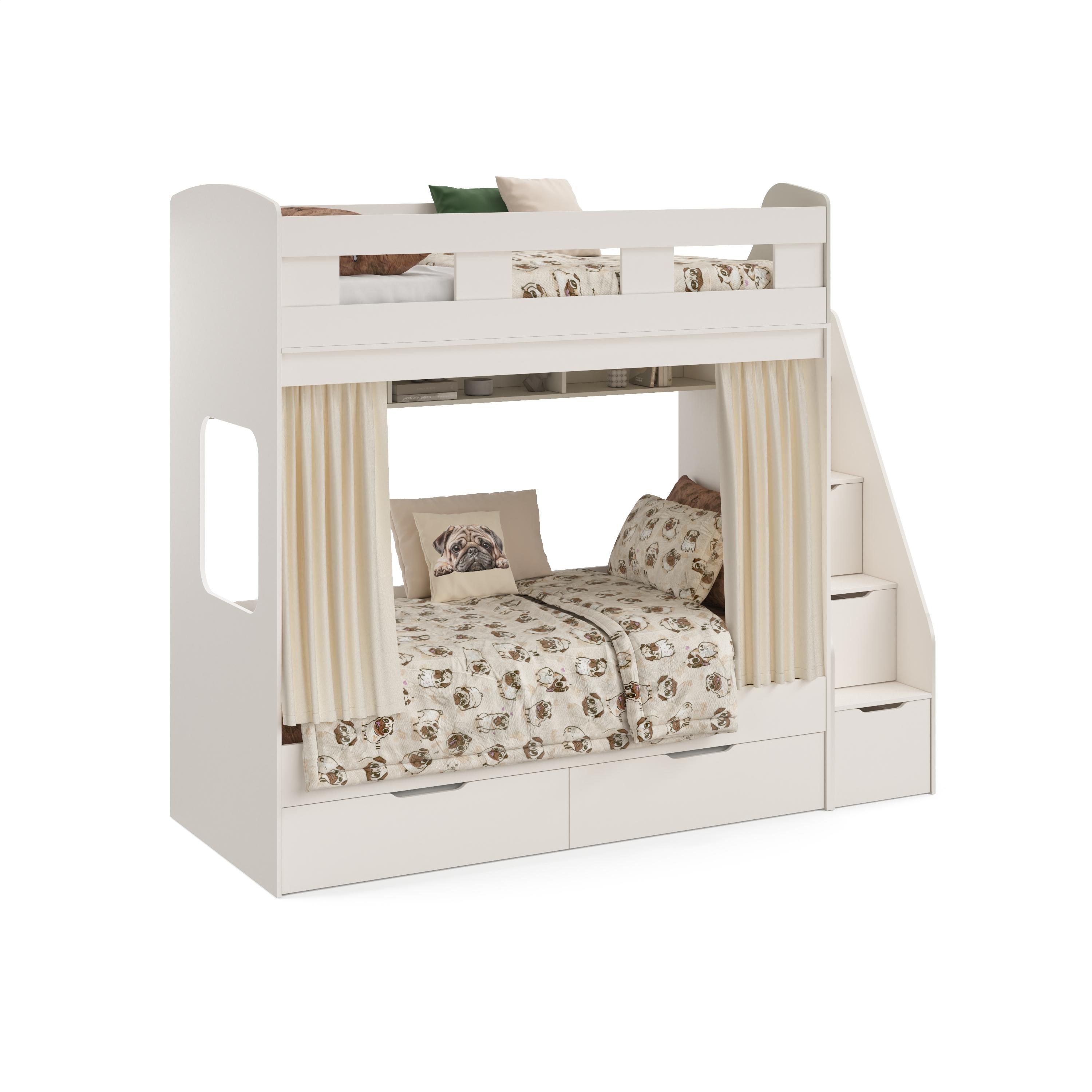 Прочная, стильная двухъярусная кровать Твинс с удобной лестницей, безопасным высоким бортиком и ящиками для хранения.