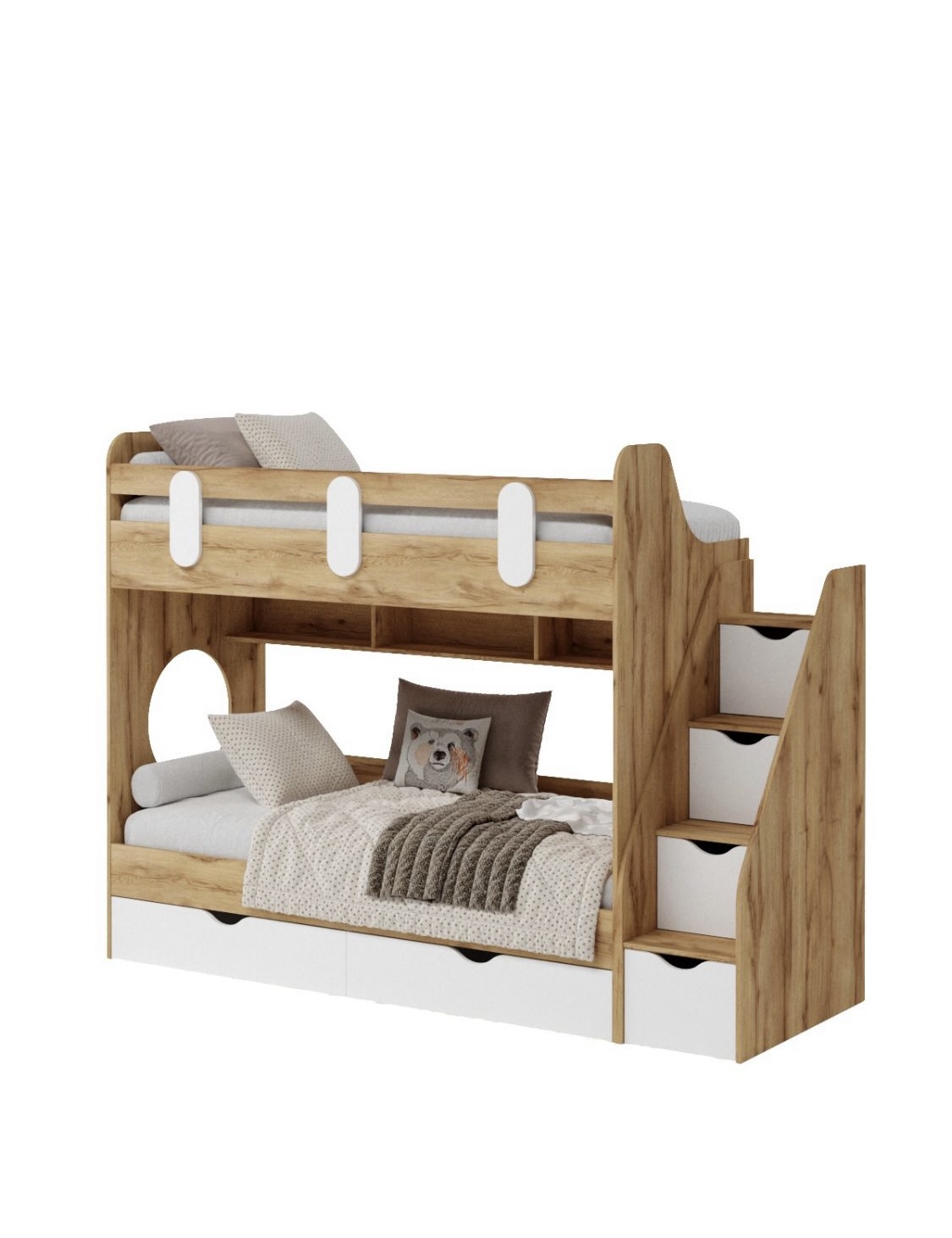 Выдвижные ящики в нижней кровати изготовлены с применением метабоксов, что делает изделие практичным и надежным.