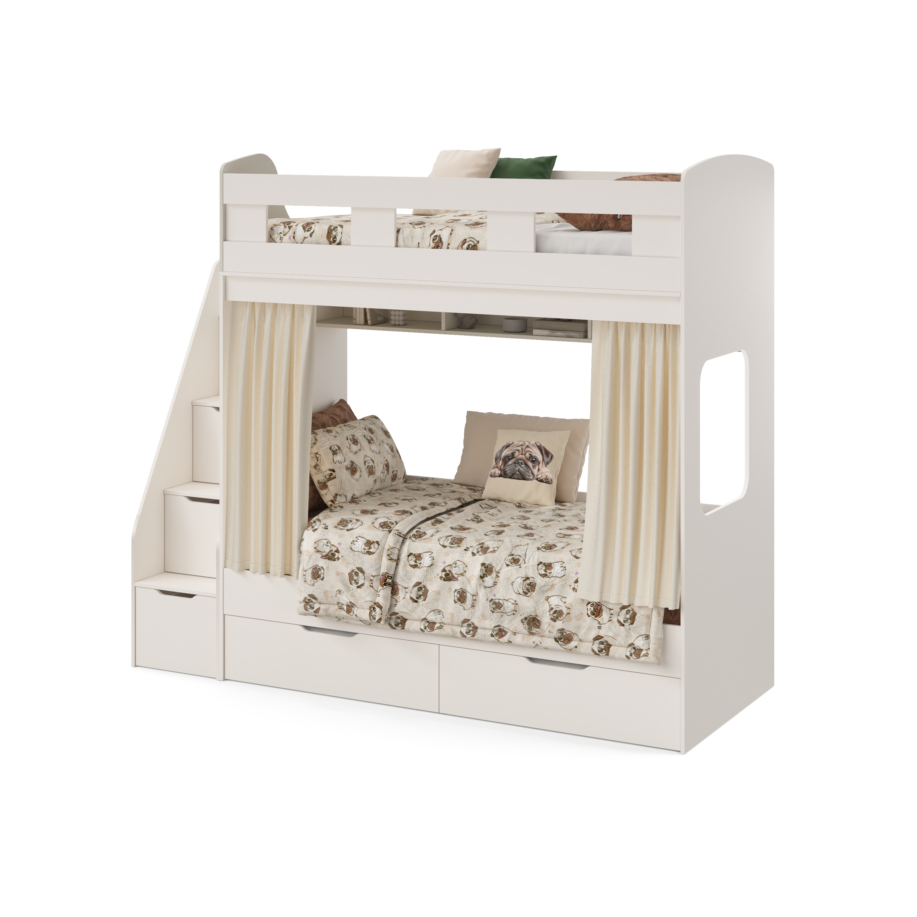 спальное место для двоих, навесная полка для книг и игрушек, вместительные выдвижные ящики под кроватью, а также безопасная лестница расположенная сбоку, обеспечивающая быстрый и удобный доступ на второй этаж, с безопасными ступенями в виде выдвижных ящиков.