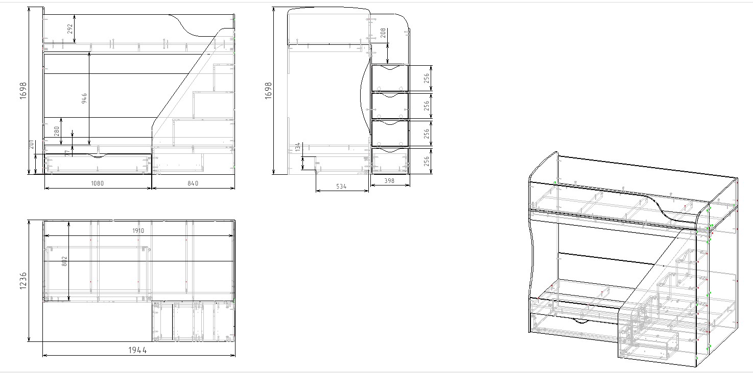 Габариты кровати: ширина 1920 х высота 1698 х глубина с учетом лестницы 1242 мм