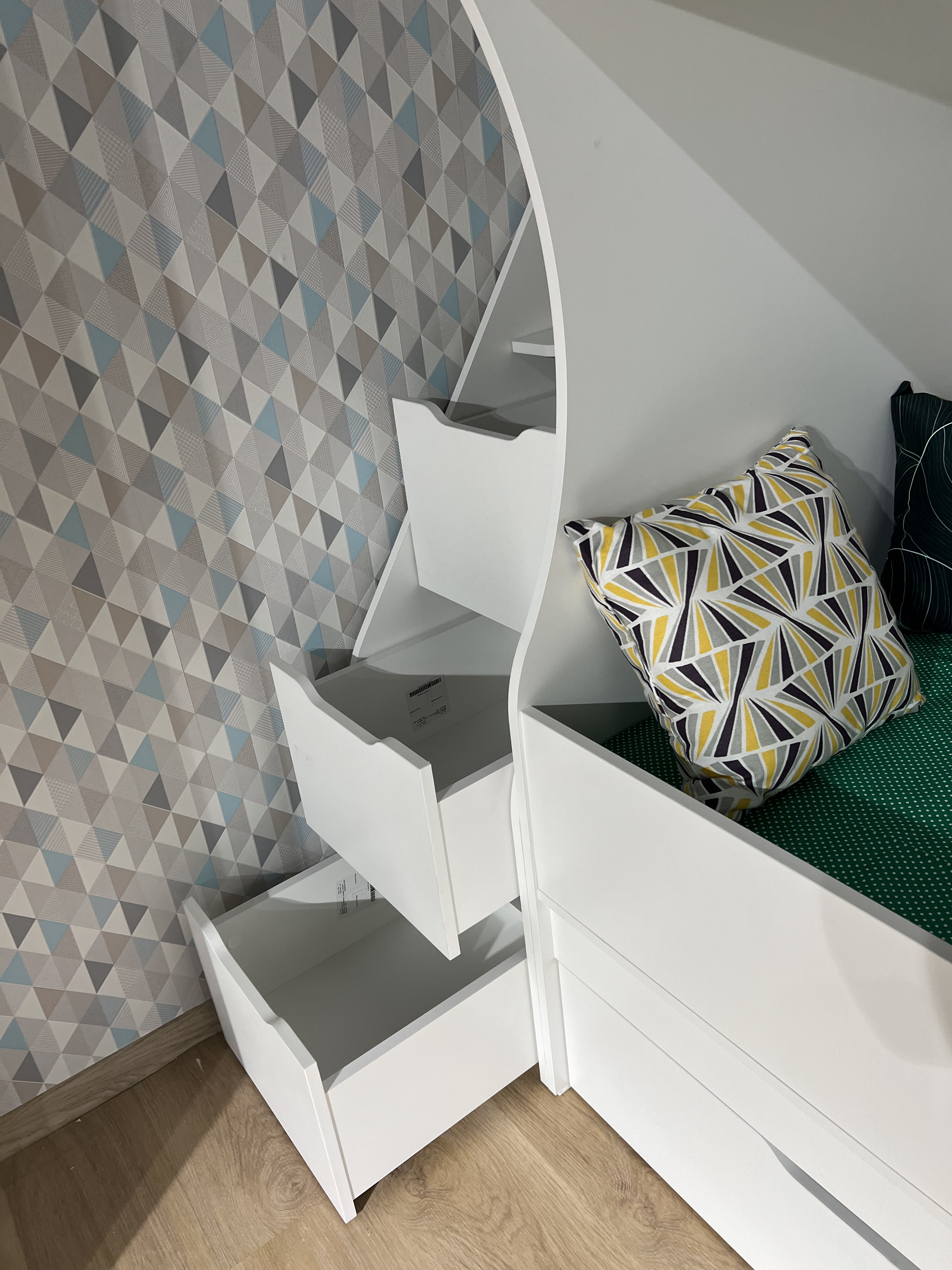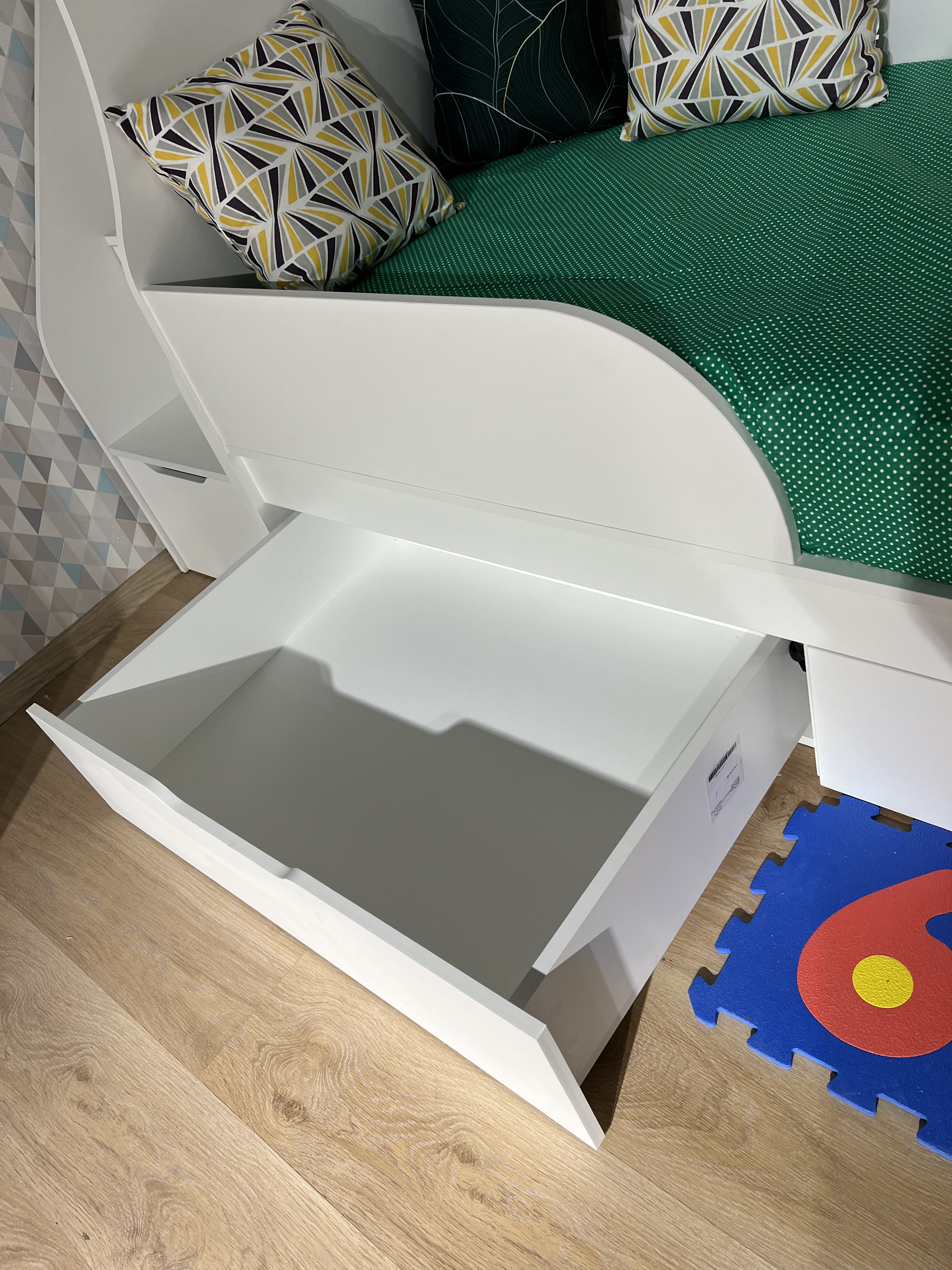 Кровать имеет также два выдвижных ящика для хранения белья или игрушек (ящики на выкатных роликах).