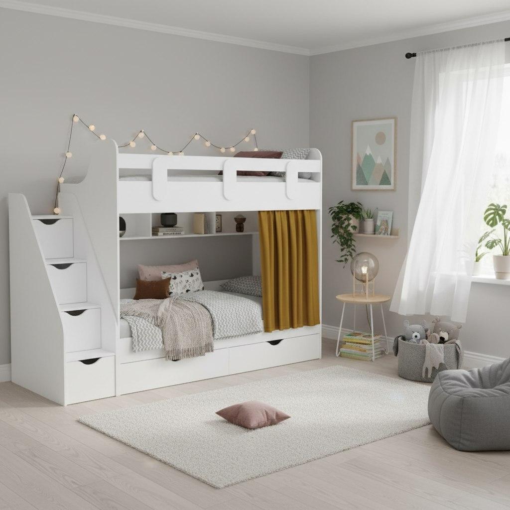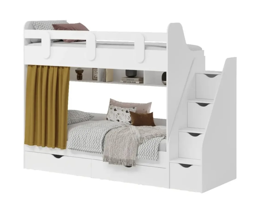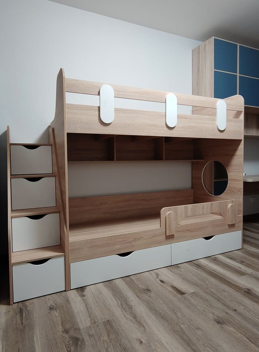 Выдвижные ящики в нижней кровати изготовлены с применением метабоксов, что делает изделие практичным и надежным.