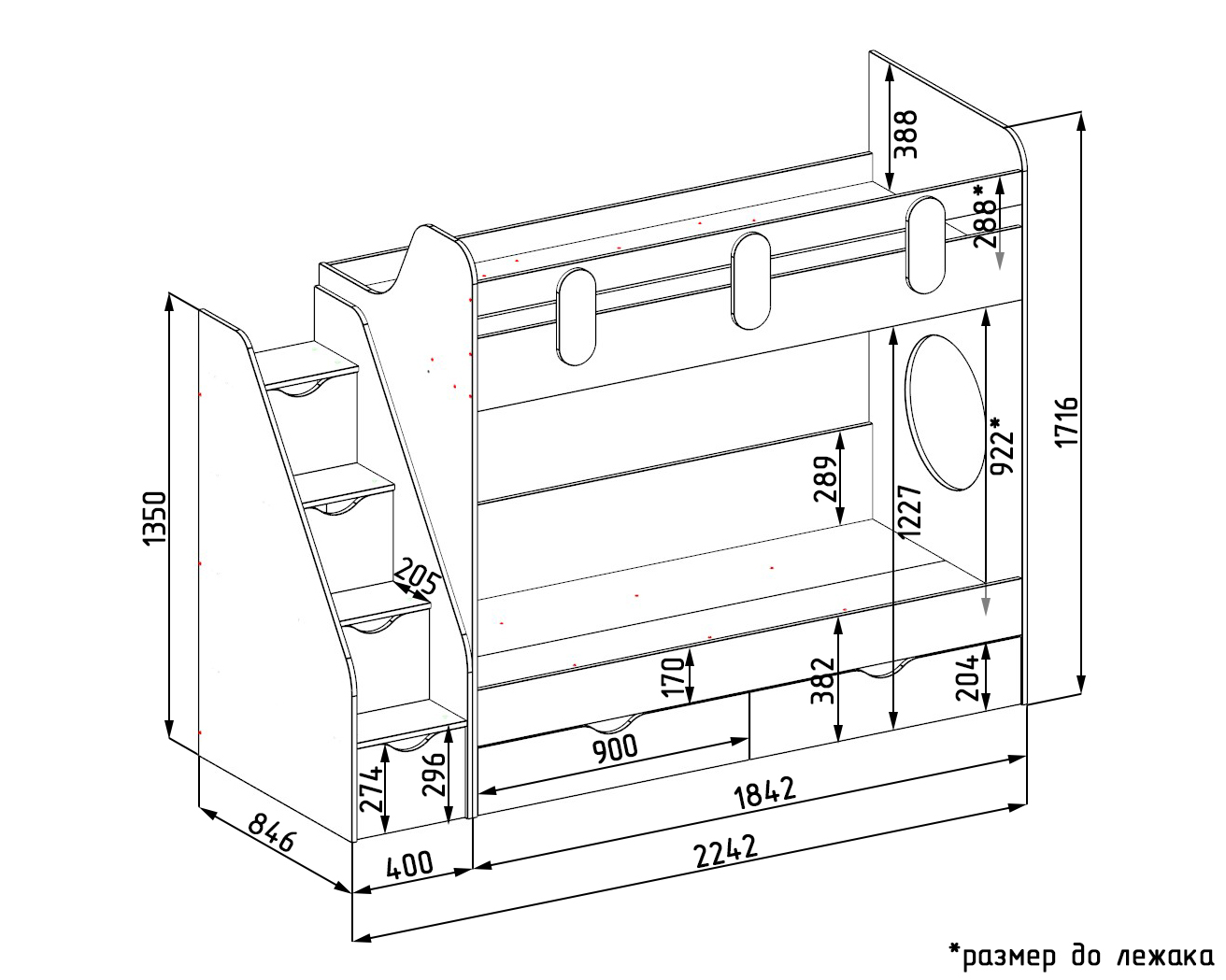 Габариты кровати с учетом лестницы: ширина 2242 х высота 1716 х глубина 846 мм