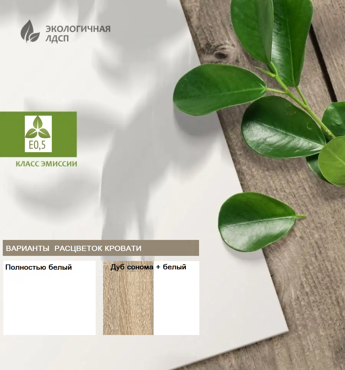 ЛДСП Е0,5. Толщина 16 мм. КРОВАТЬ ДОСТУПНА В РАСЦВЕТКАХ: полностью белый, дуб сонома + белый. |
