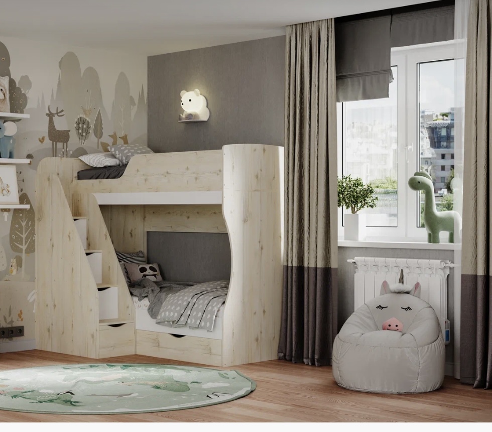 В нижнюю кровать встроен выдвижной ящик для белья и игрушек.
