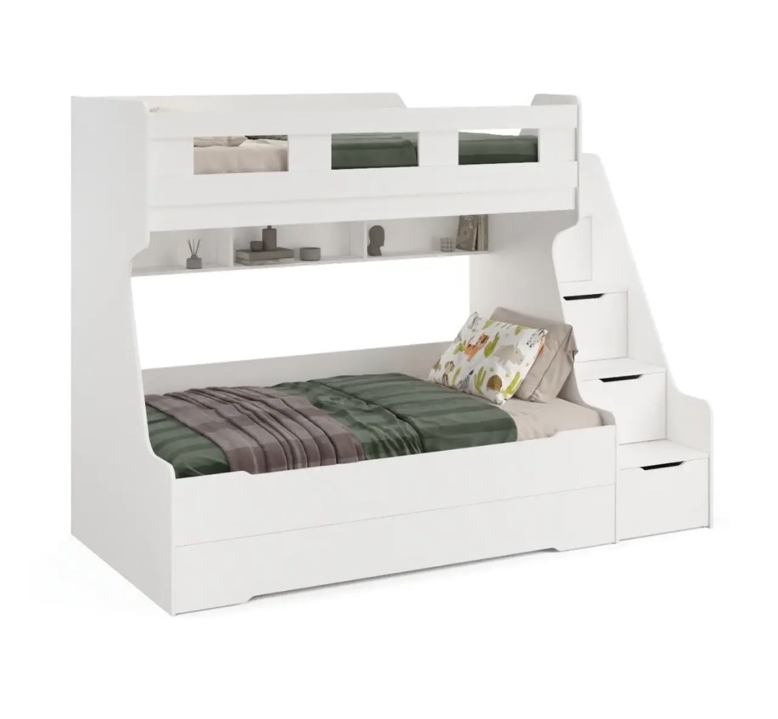 Высокая нагрузка на спальные места. Дополнительное выдвижное спальное место. Удобная лестница. Высокий, безопасный бортик