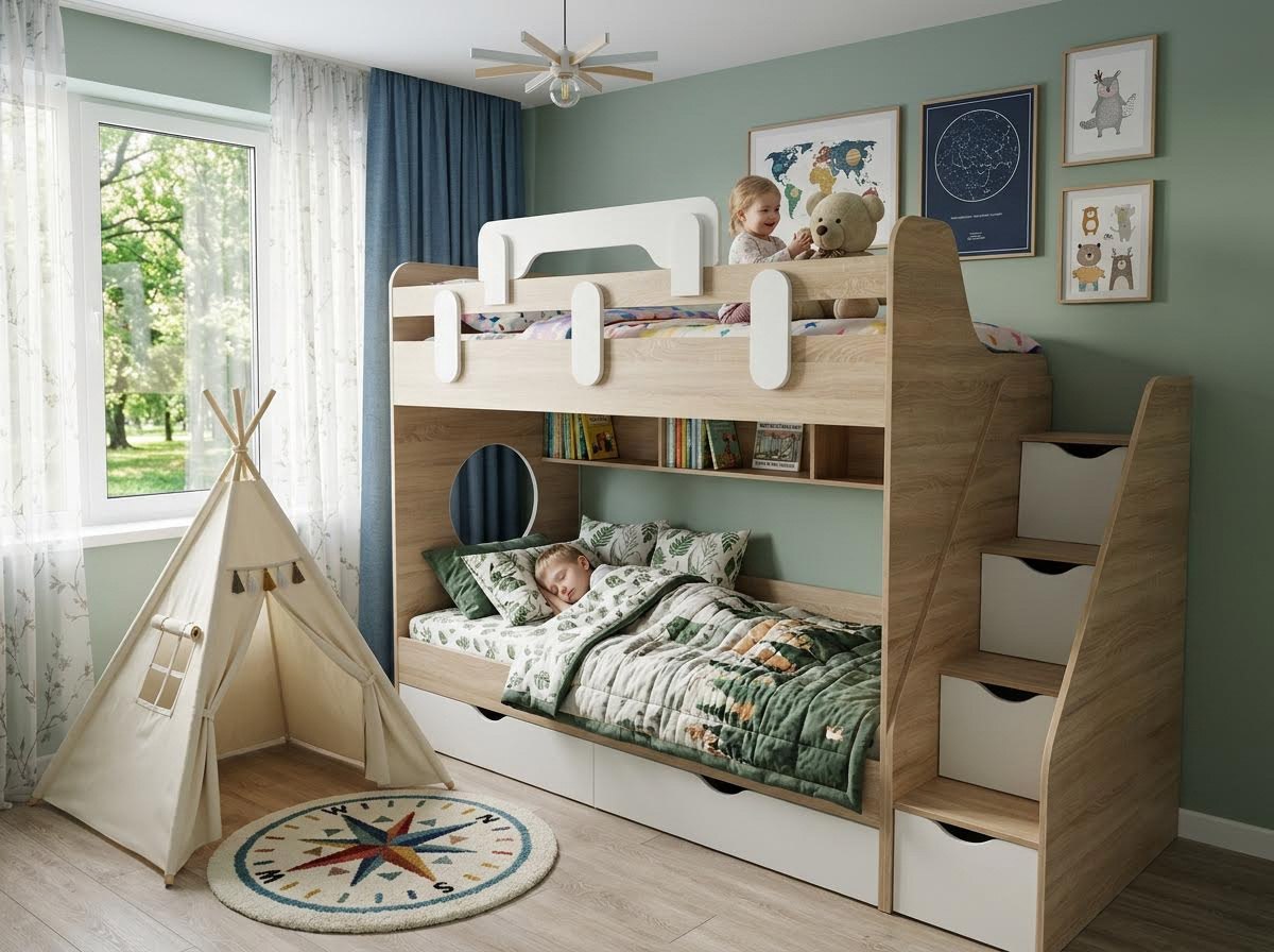 Высота кровати рассчитана с учетом того, чтобы на втором ярусе ребенку было не жарко спать.