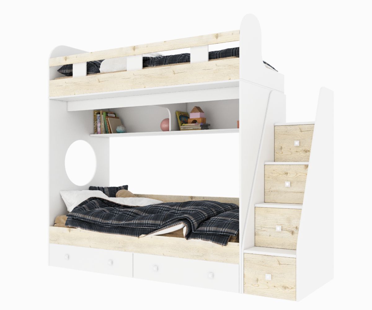 Стильная двухъярусная кровать Юниор 1 с удобной лестницей, безопасным высоким бортиком и ящиками для хранения.