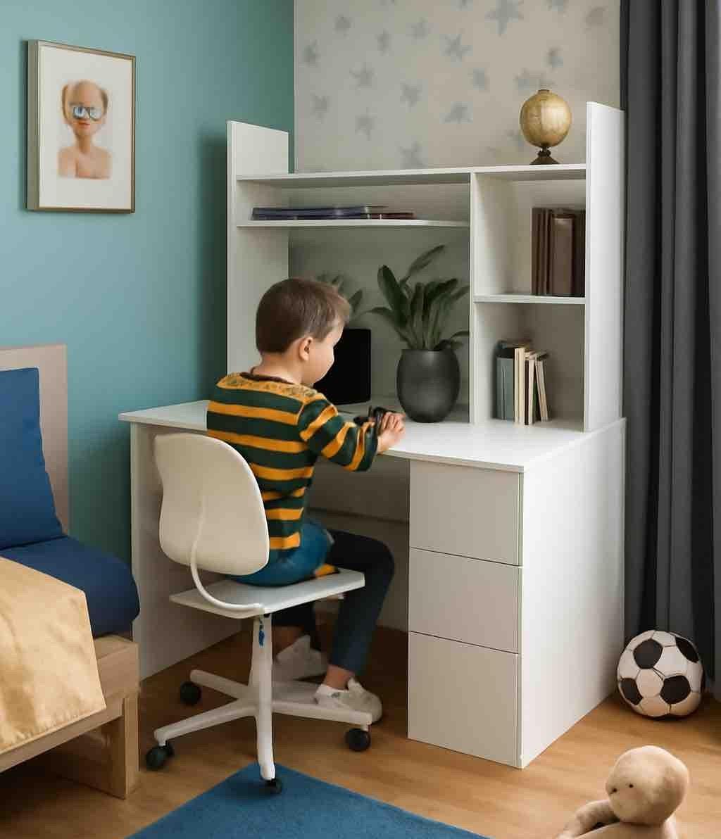 Практичный и удобный стол займет немного места в комнате и в тоже время позволит разместить учебники, любимые книги и игрушки.