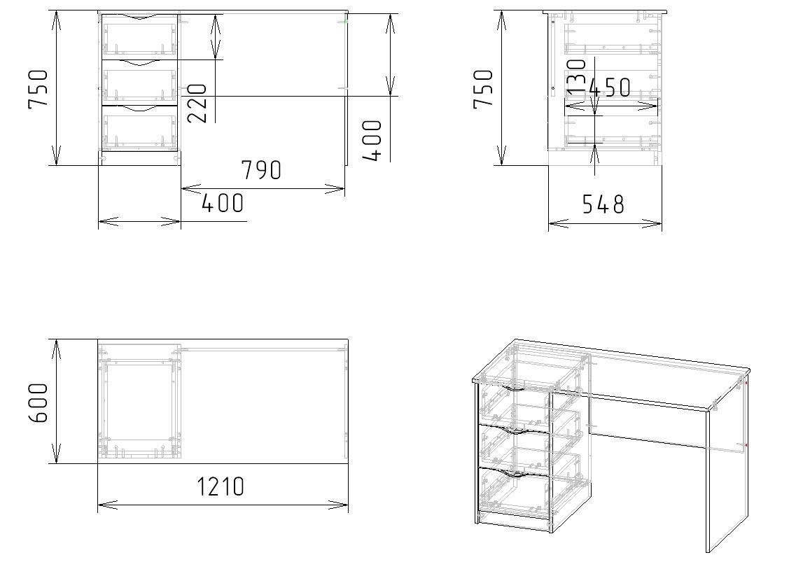 В стол встроены три выдвижных ящика на шариковых направляющих.