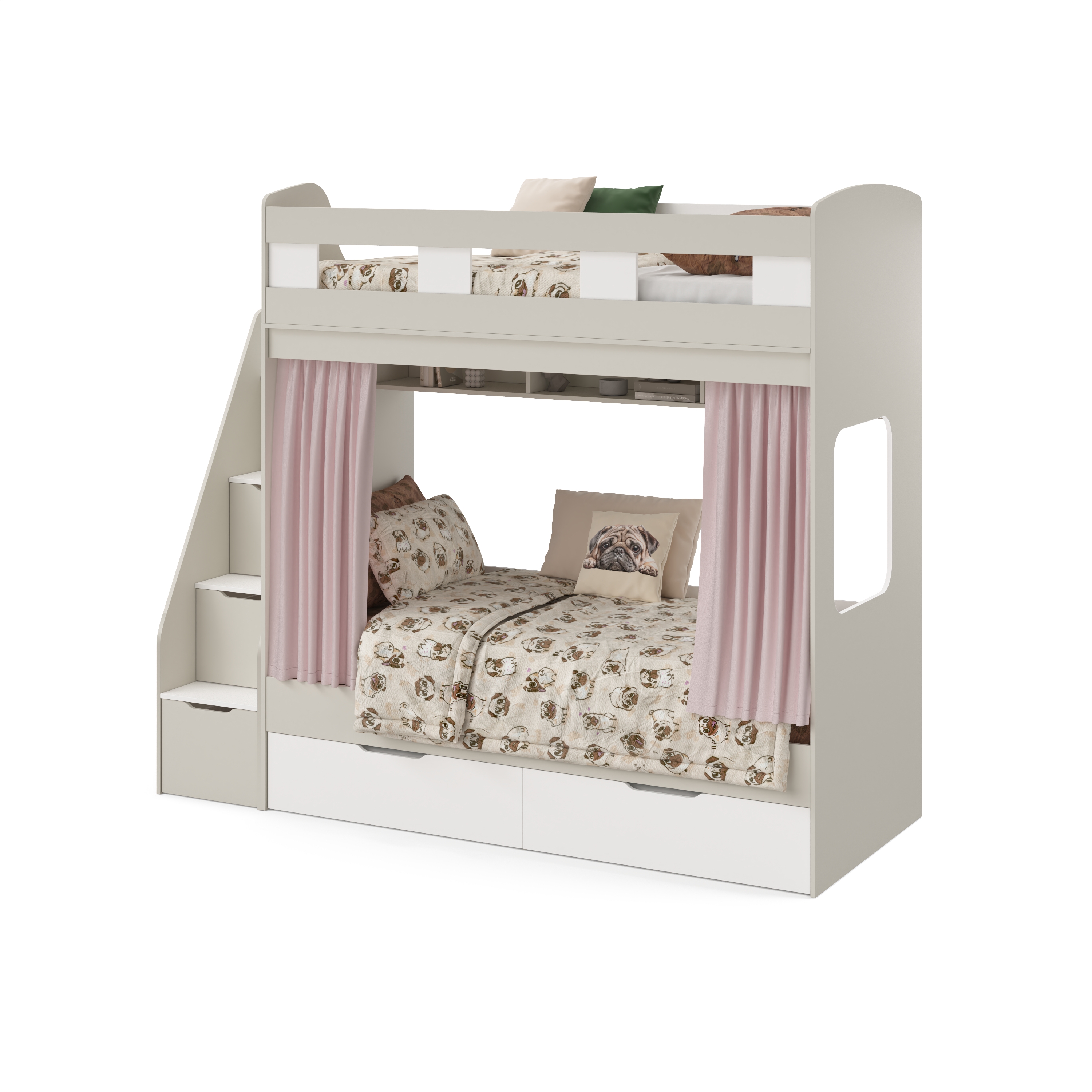 спальное место для двоих, навесная полка для книг и игрушек, вместительные выдвижные ящики под кроватью, а также безопасная лестница расположенная сбоку, обеспечивающая быстрый и удобный доступ на второй этаж, с безопасными ступенями в виде выдвижных ящиков.