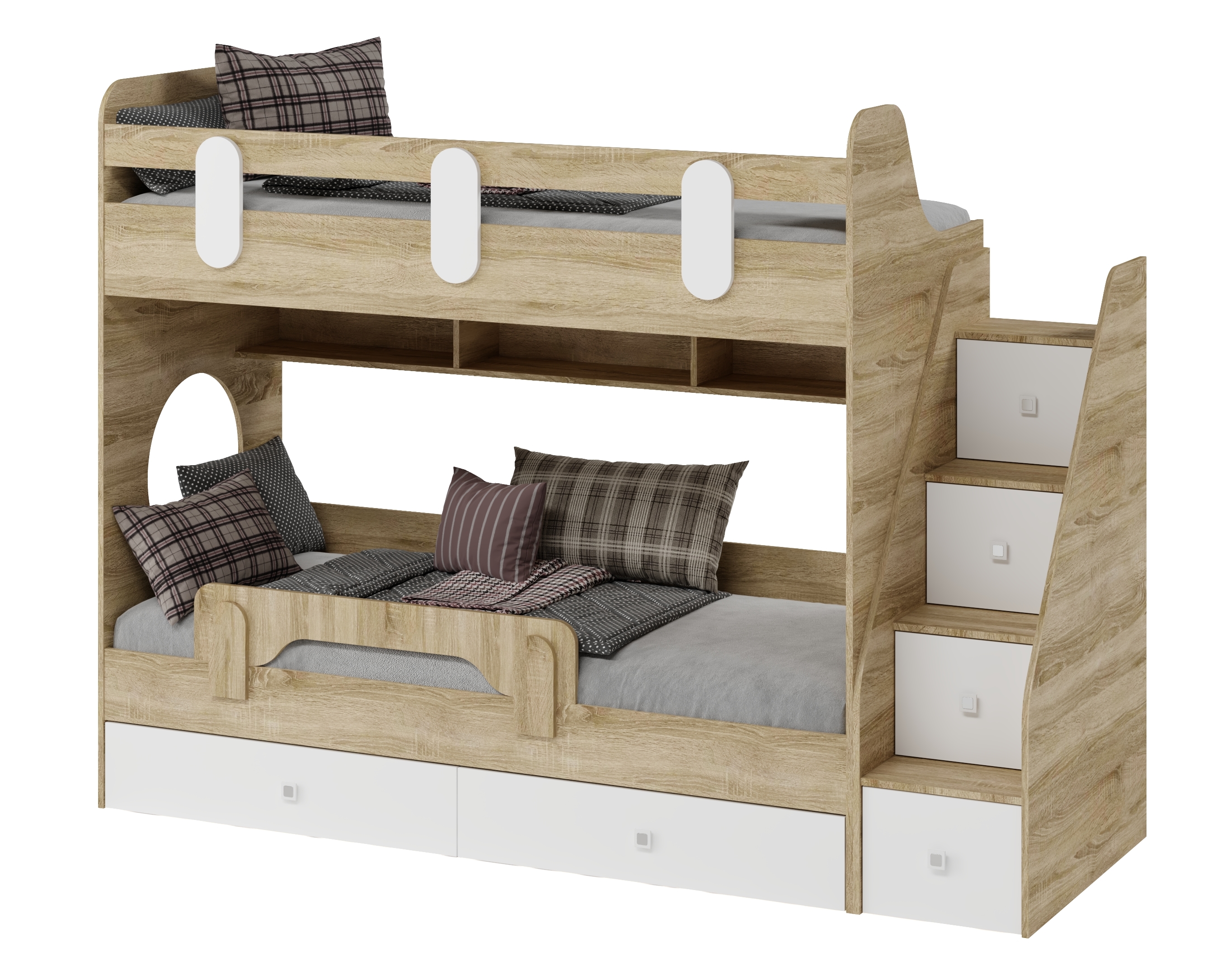 Выдвижные ящики в нижней кровати имеют глубину 450 мм, высоту 150 мм