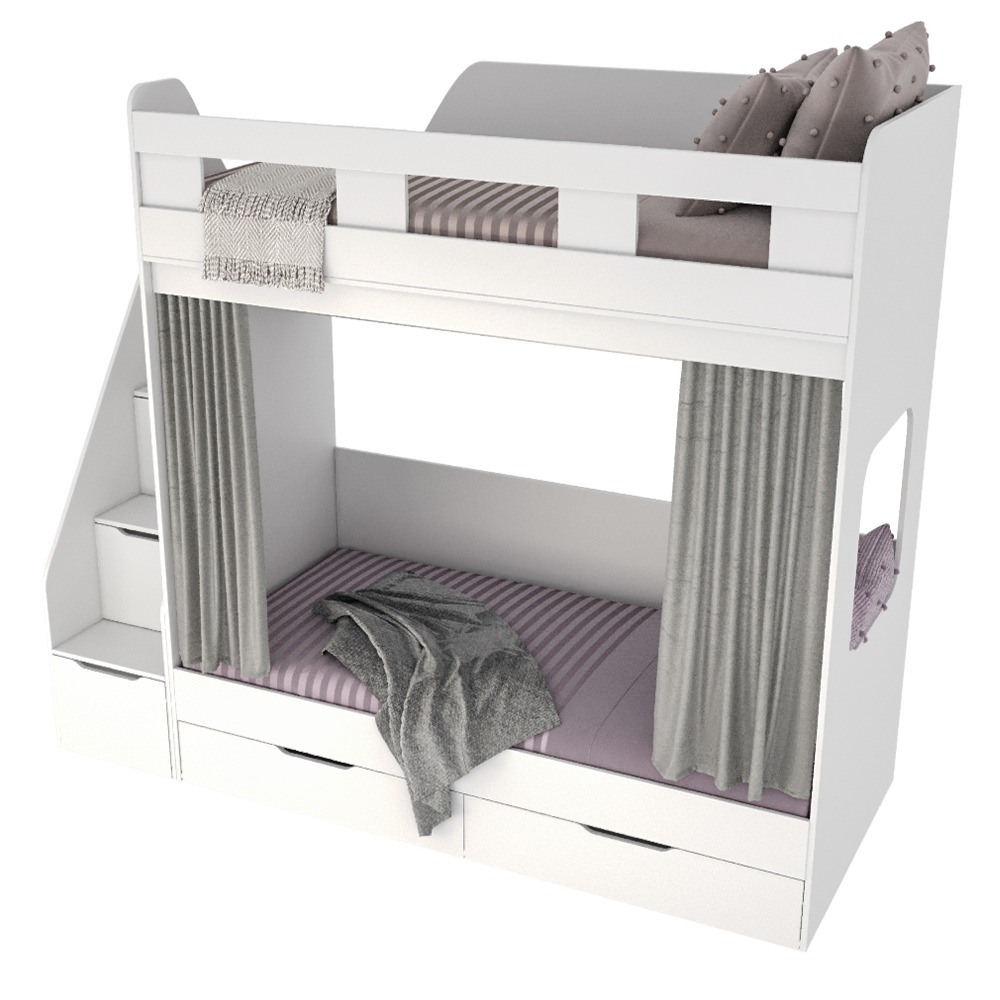 спальное место для двоих, навесная полка для книг и игрушек, вместительные выдвижные ящики под кроватью, а также безопасная лестница расположенная сбоку, обеспечивающая быстрый и удобный доступ на второй этаж, с безопасными ступенями в виде выдвижных ящиков.