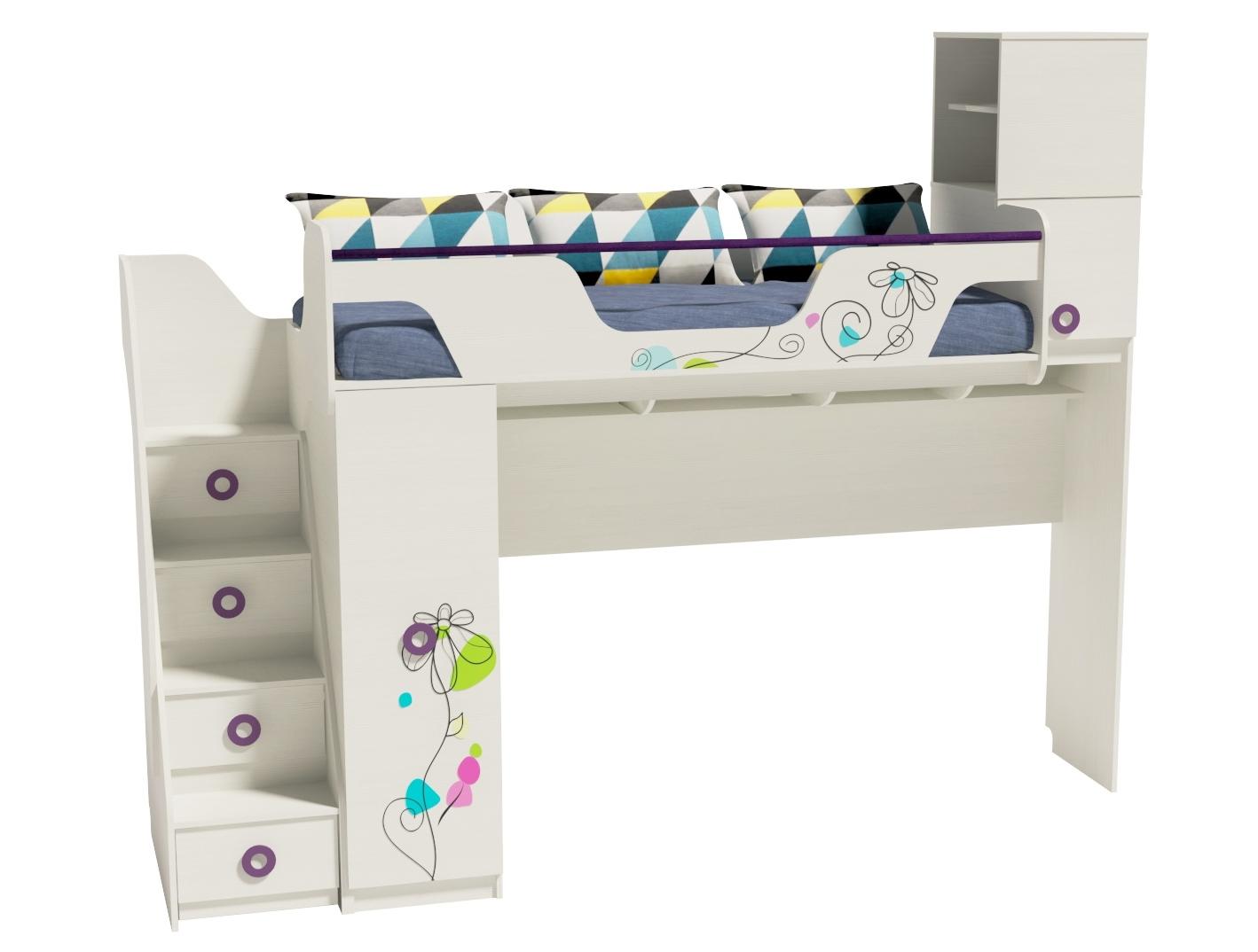 В кровать встроены шкаф для размещения одежды и удобная лестница с ящиками для игрушек.