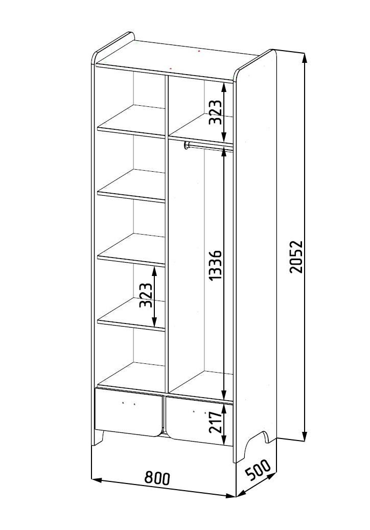 Внутри шкафа имеются штанга, боковые и верхние полки.