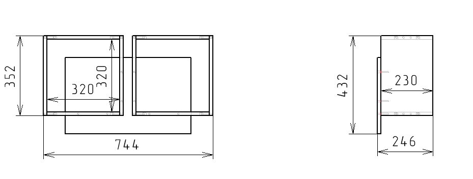 Габариты полки: ширина 744, глубина 246, высота 432 мм