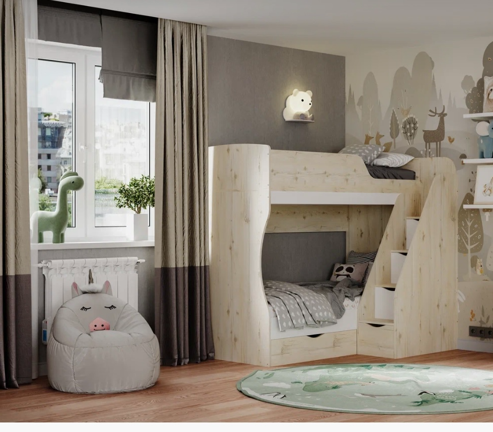 В нижнюю кровать встроен выдвижной ящик для белья и игрушек.