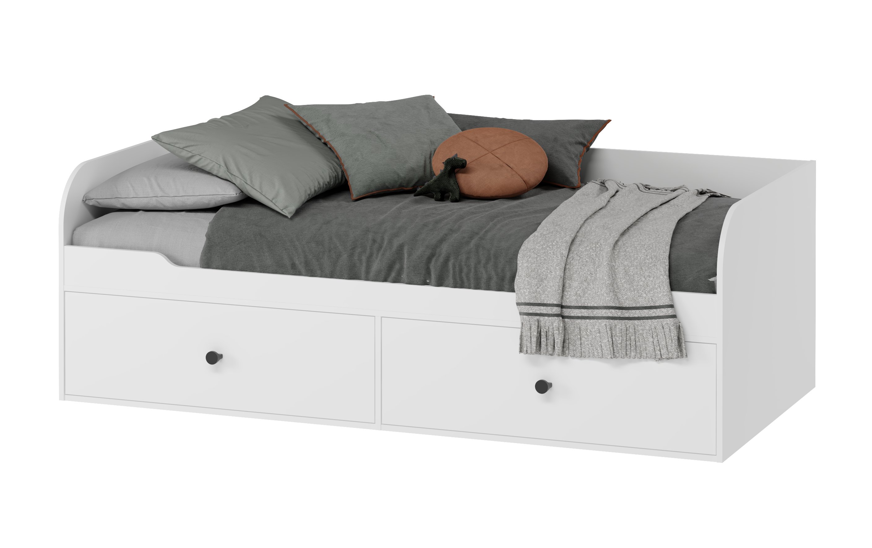 В кровать встроены два выдвижных ящика на направляющих скрытого монтажа с доводчиками.