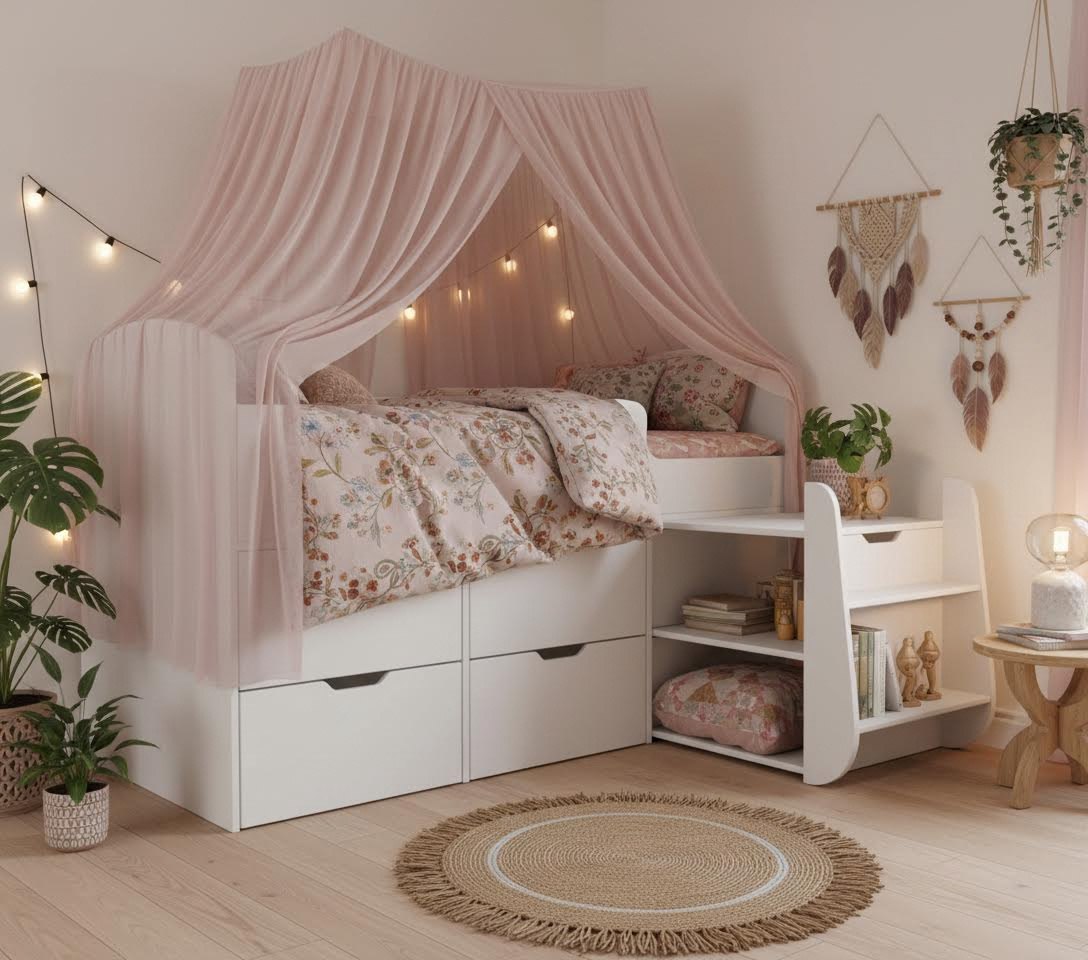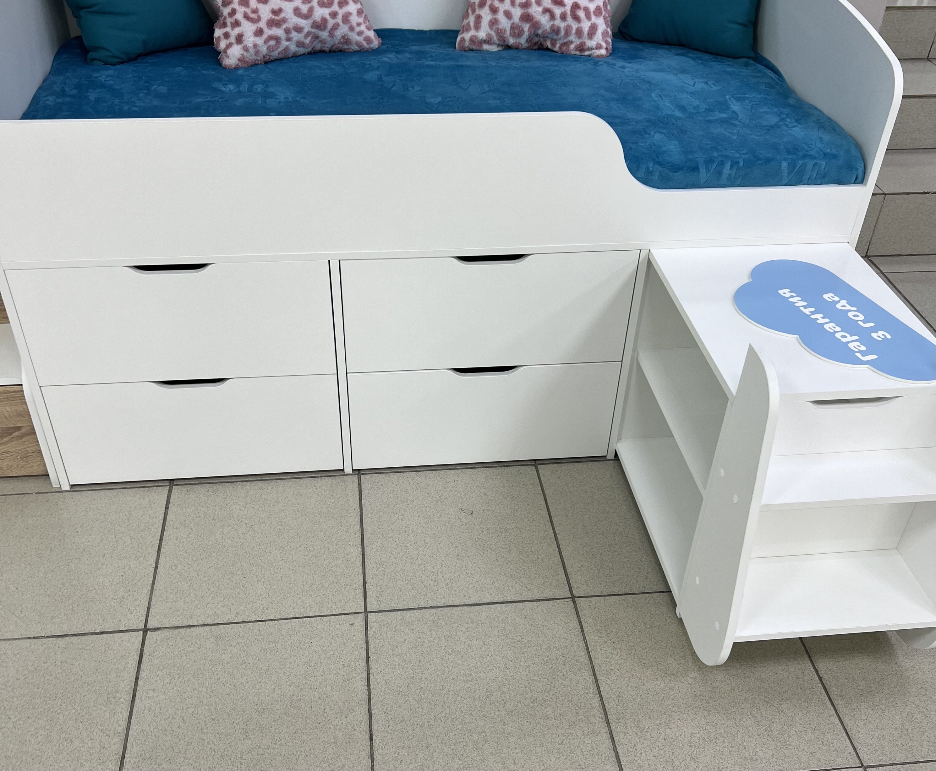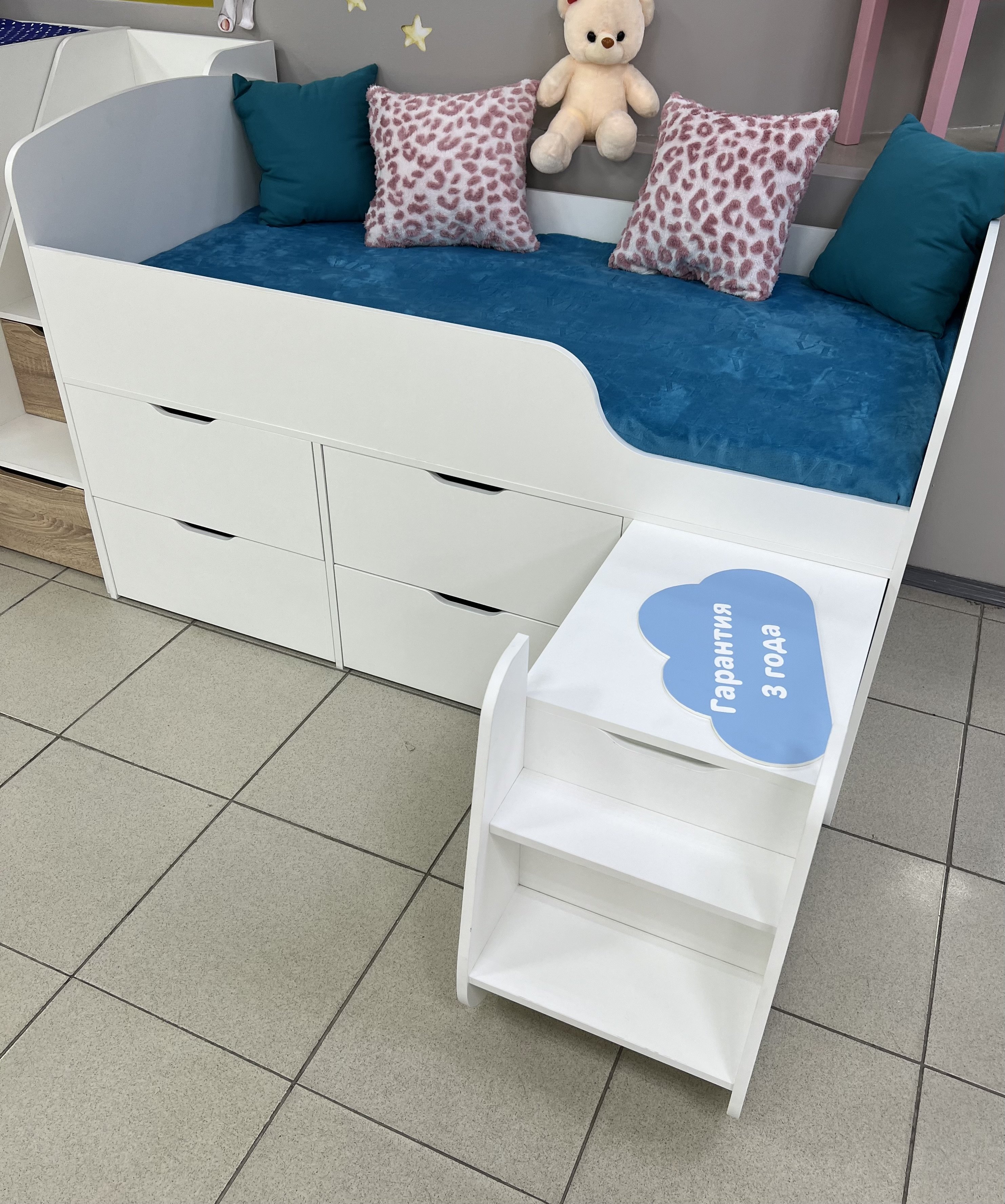 Безопасный, высокий бортик, удобная выдвижная лестница с внутренними полочками и небольшая высота кровати сделаны специально для детей младшего возраста.