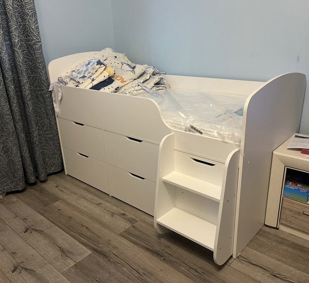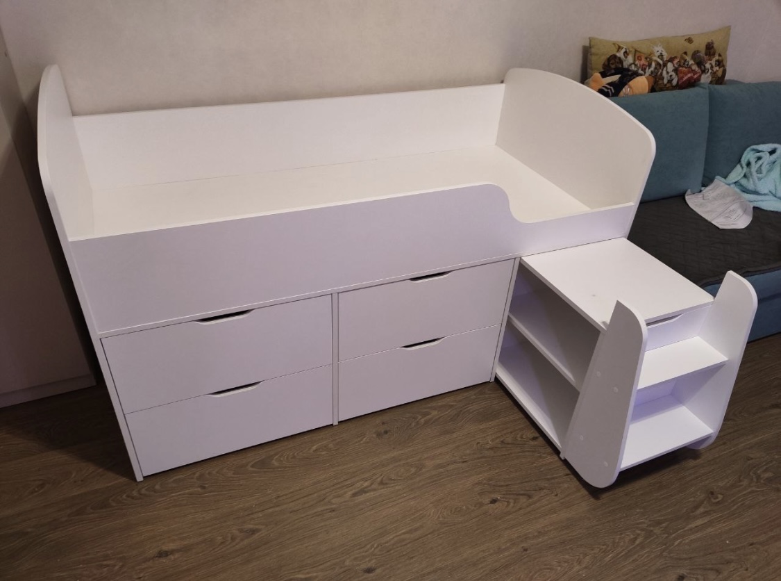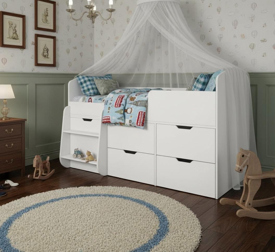 Безопасный, высокий бортик, удобная выдвижная лестница с внутренними полочками и небольшая высота кровати сделаны специально для детей младшего возраста.