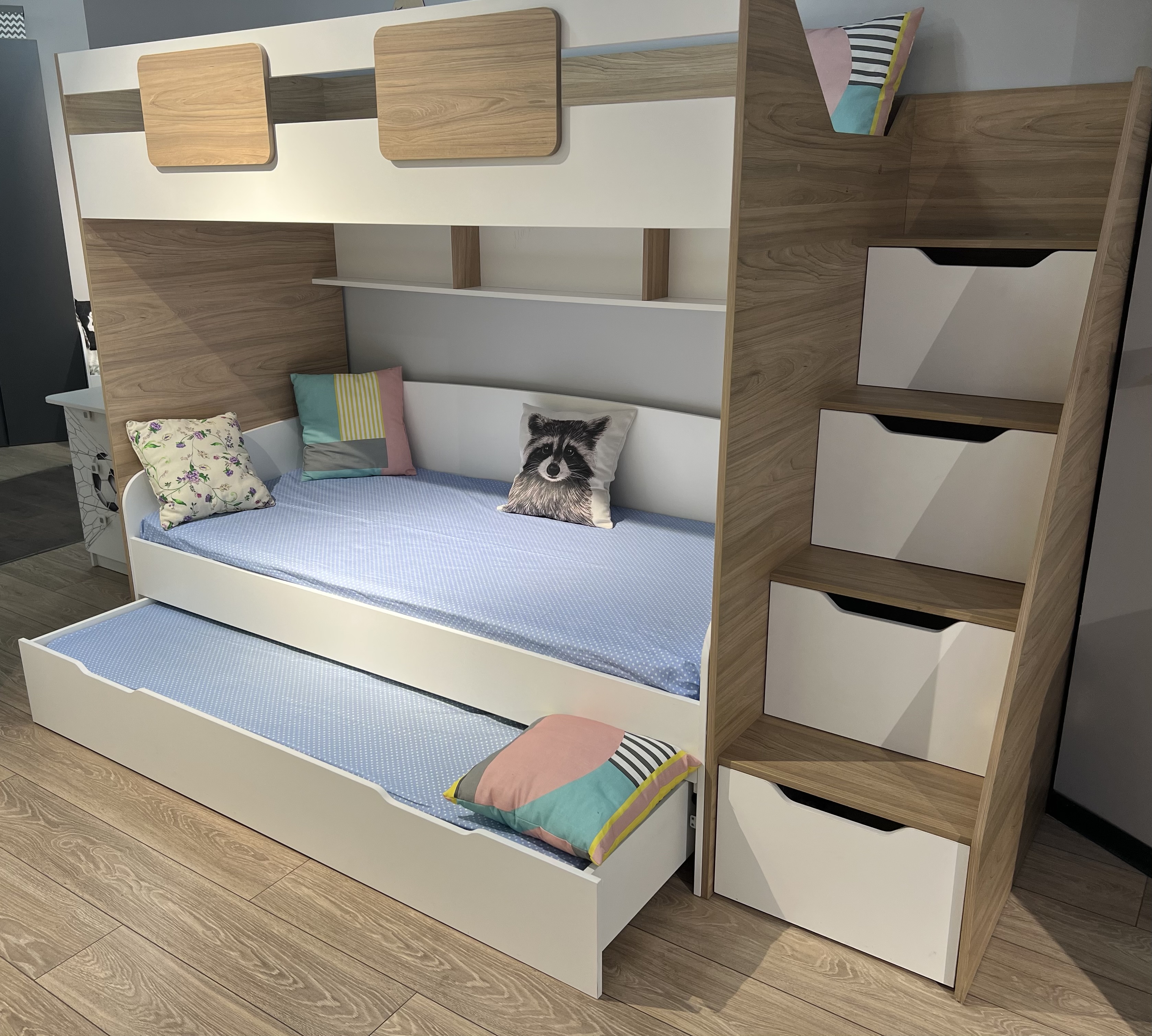 Вместо них - цельный и прочный настил из ЛДСП, который выдерживает сверхвысокую нагрузку и позволяет расположиться даже взрослому с ребенком.