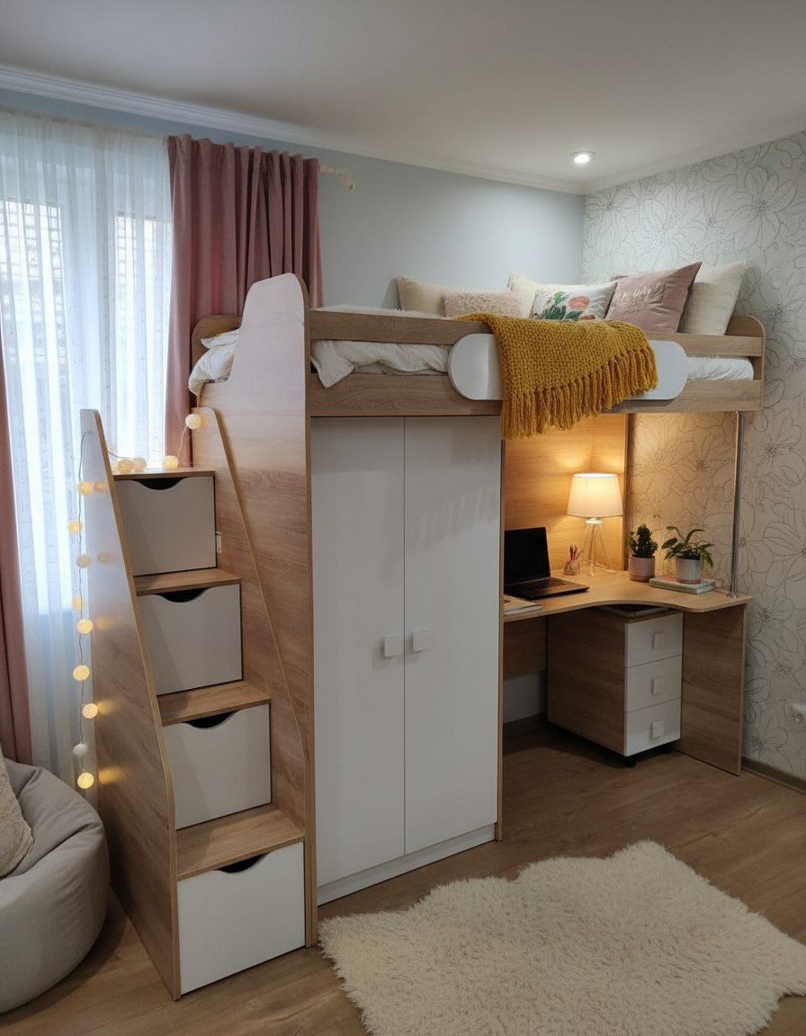 Экономия пространства: под кроватью расположен стол с тумбой для учебы и удобная полочка, а рядом – шкаф для хранения вещей.