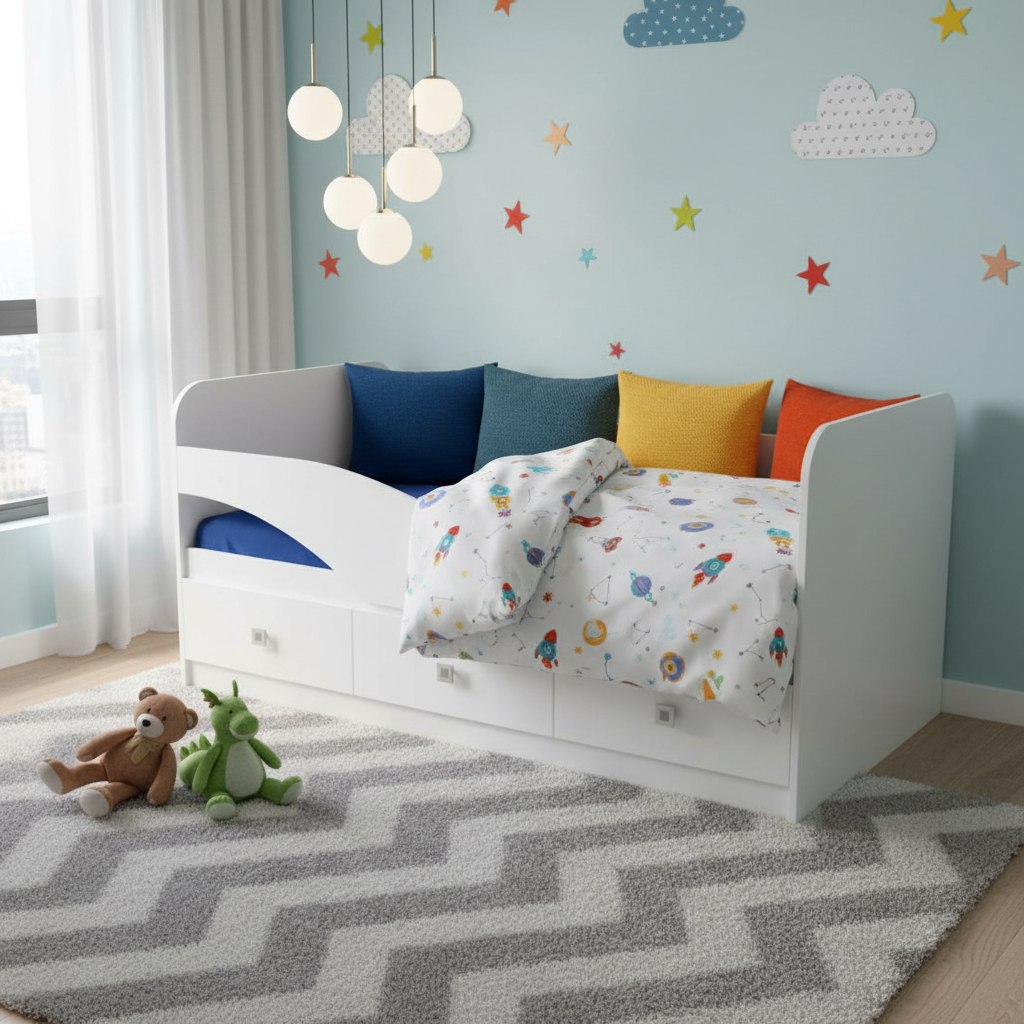 Защитный бортик предохранит ребенка от падения во сне.