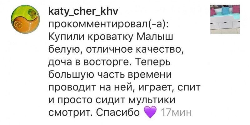 <comment>Спасибо, что пошли нам навстречу и сделали кроватку в сиреневом цвете. Доча счастлива! Благодарю от всей души всю вашу команду! </comment>