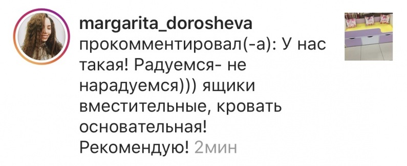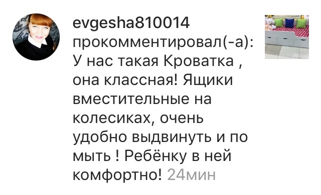 <comment>Здравствуйте. Искала качественную кровать в белом цвете. Нашла в вашем магазине, была на выставке сначала, посмотрела в живую) Дочка очень довольна новой кроваткой. Цена и качество отличные. Большие ящики, очень удобные. Спасибо вам и процветания!</comment>