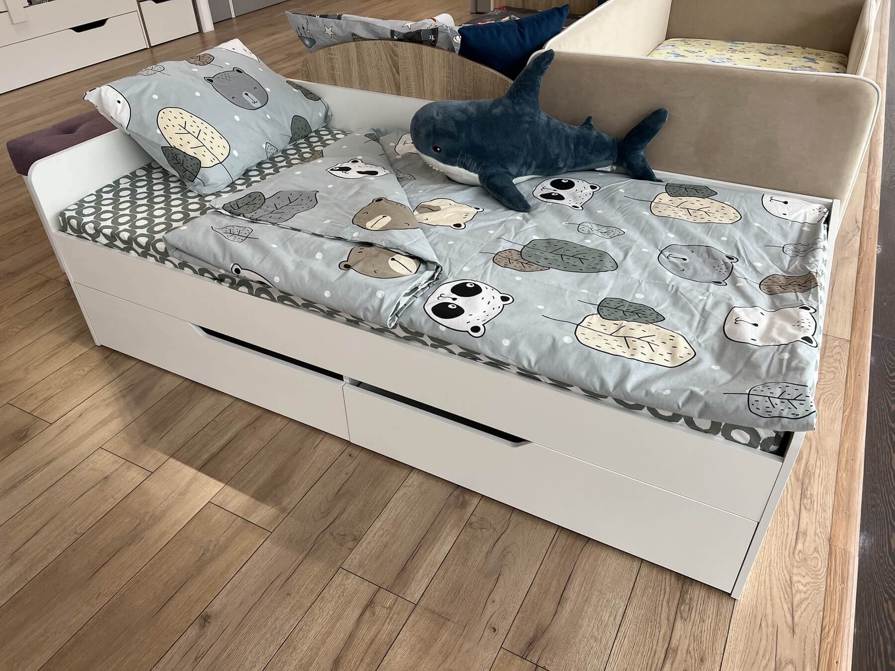 В кровать встроены два выдвижных ящика на шариковых направляющих полного выдвижения.