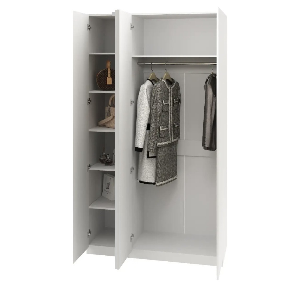 В компактном шкафу можно разместить большое количество одежды, обувь, аксессуары, постельные принадлежности, коробки и органайзеры.