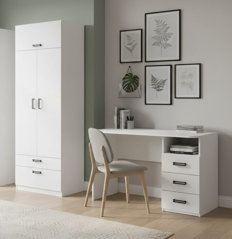 Мебель выполнена из сертифицированного, качественного, экологически чистого ЛДСП класса Е0,5 в белом цвете.