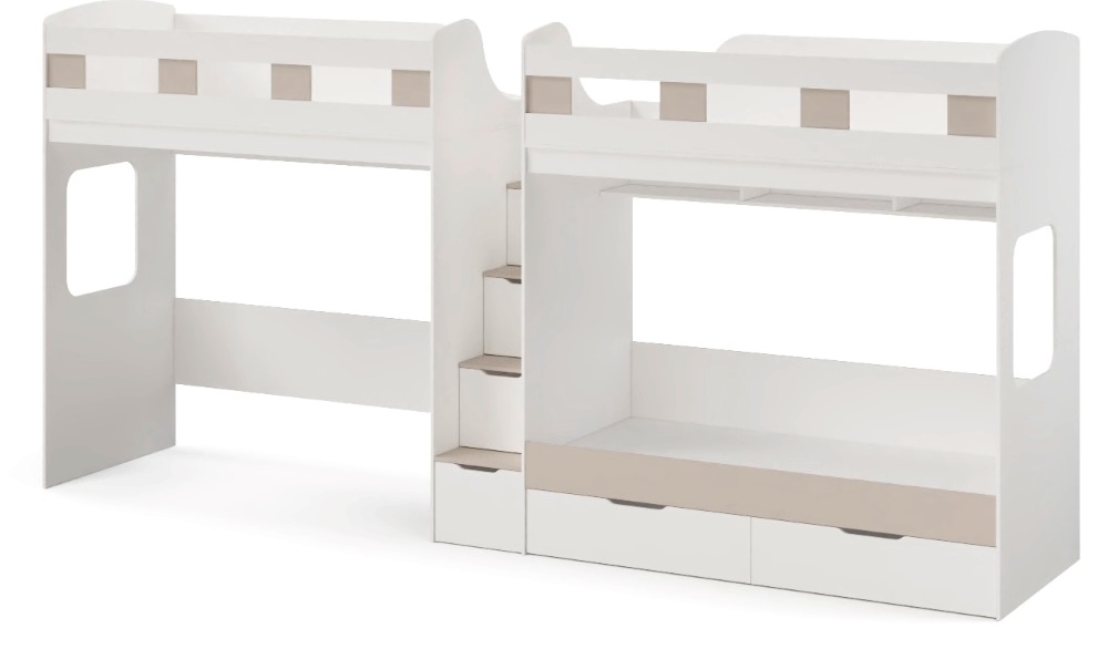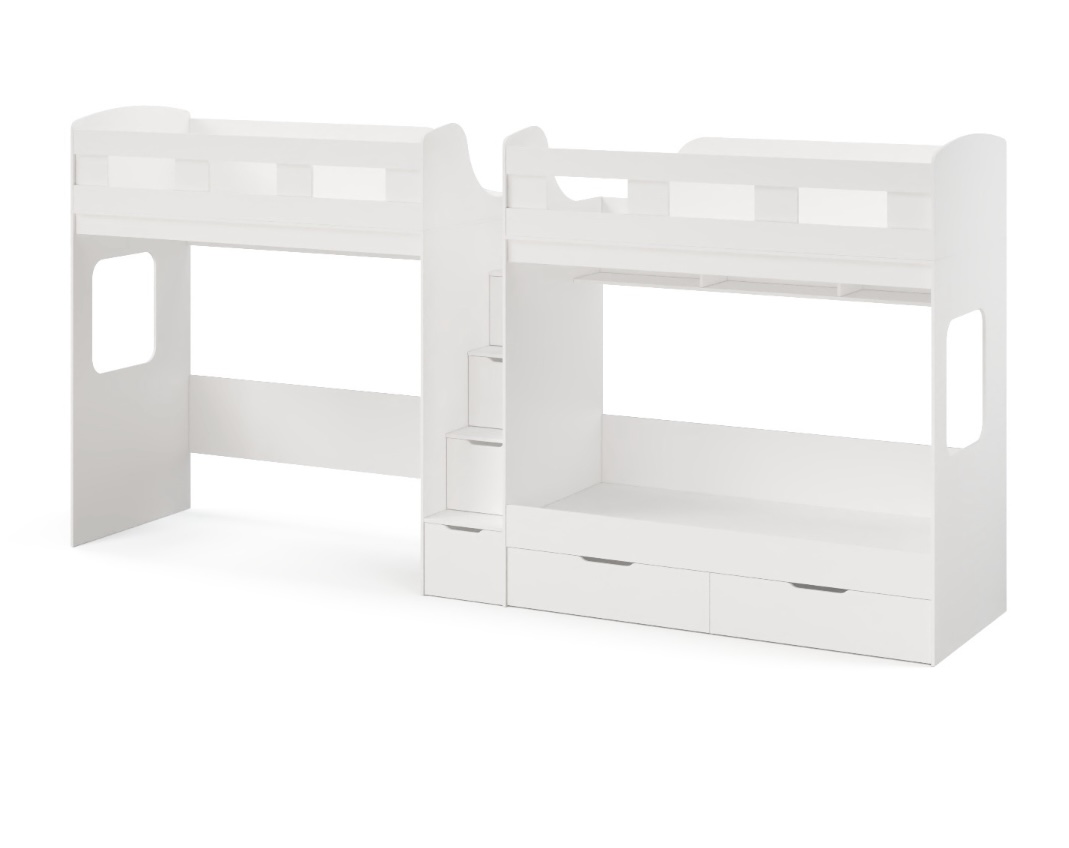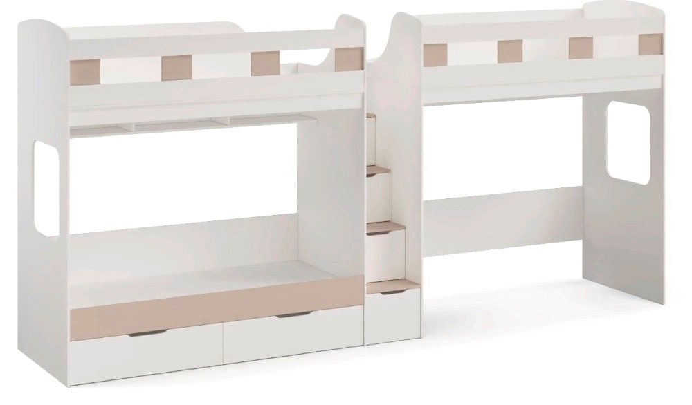 Высокая нагрузка на спальные места.. Удобная лестница-комод. Высокие, безопасные бортики. Прочные ящики! |