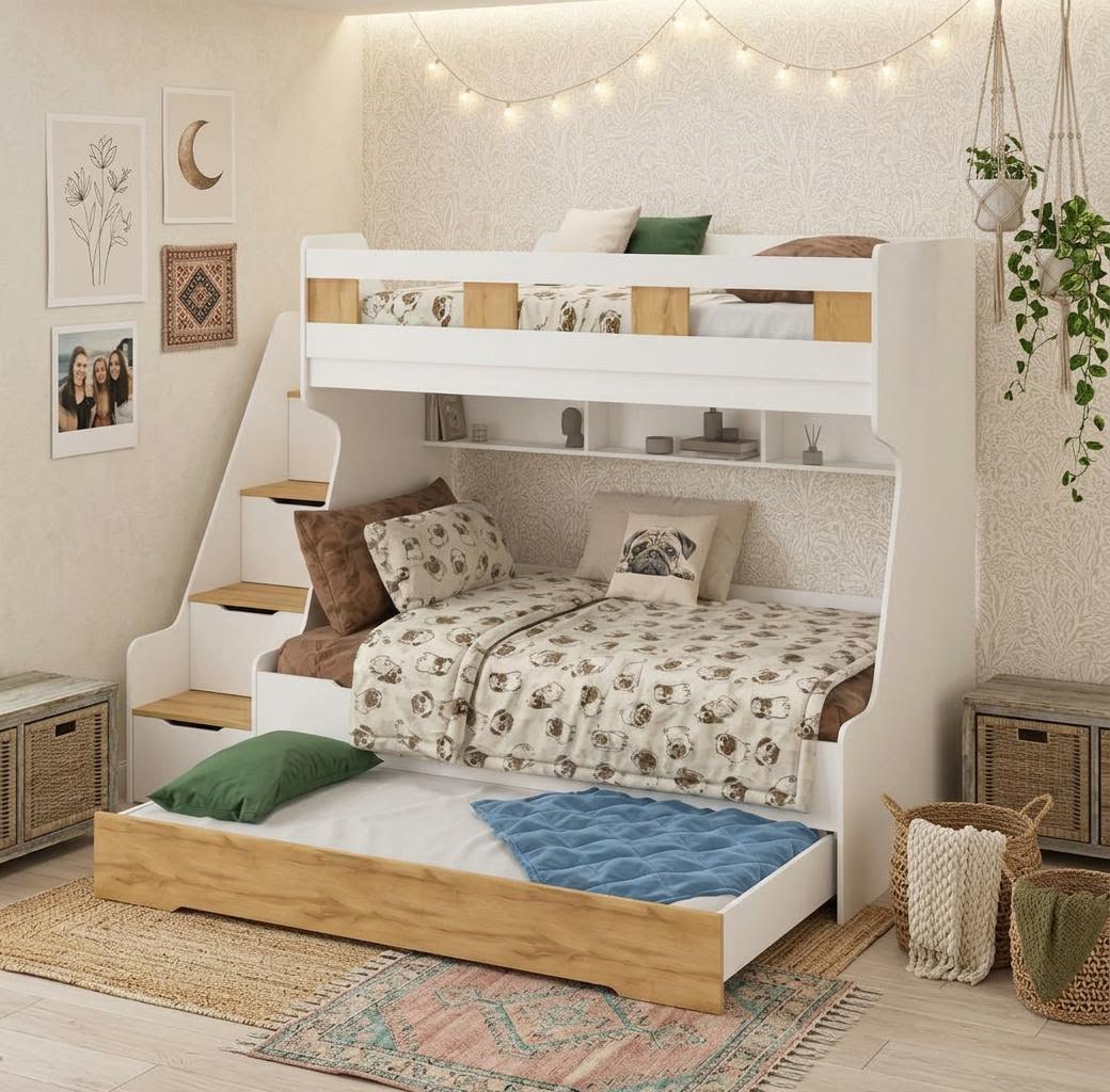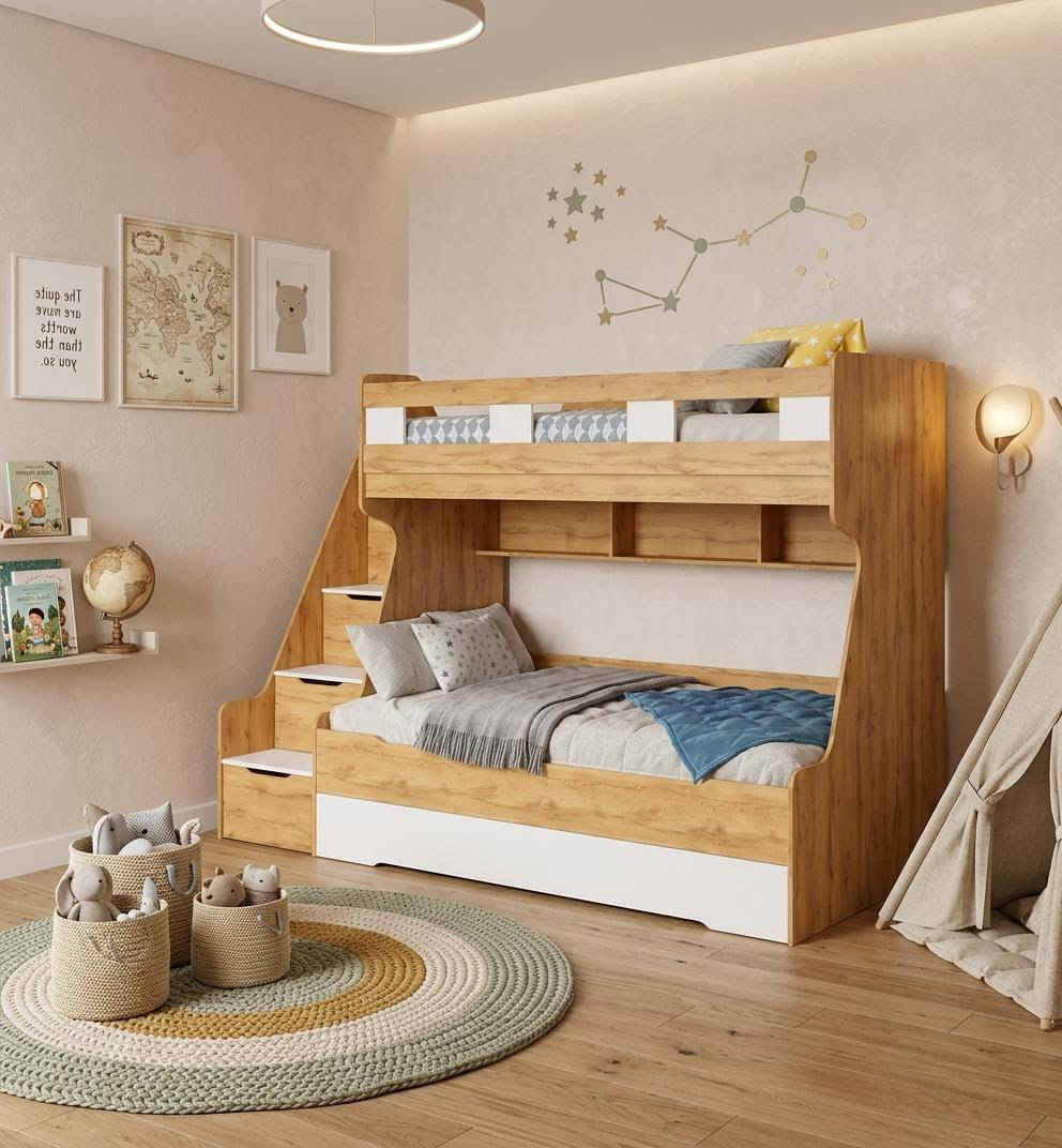 - Максимальная функциональность - два яруса обеспечивают удобство и экономию пространства, а дополнительное спальное место легко выдвигается, когда это необходимо.
