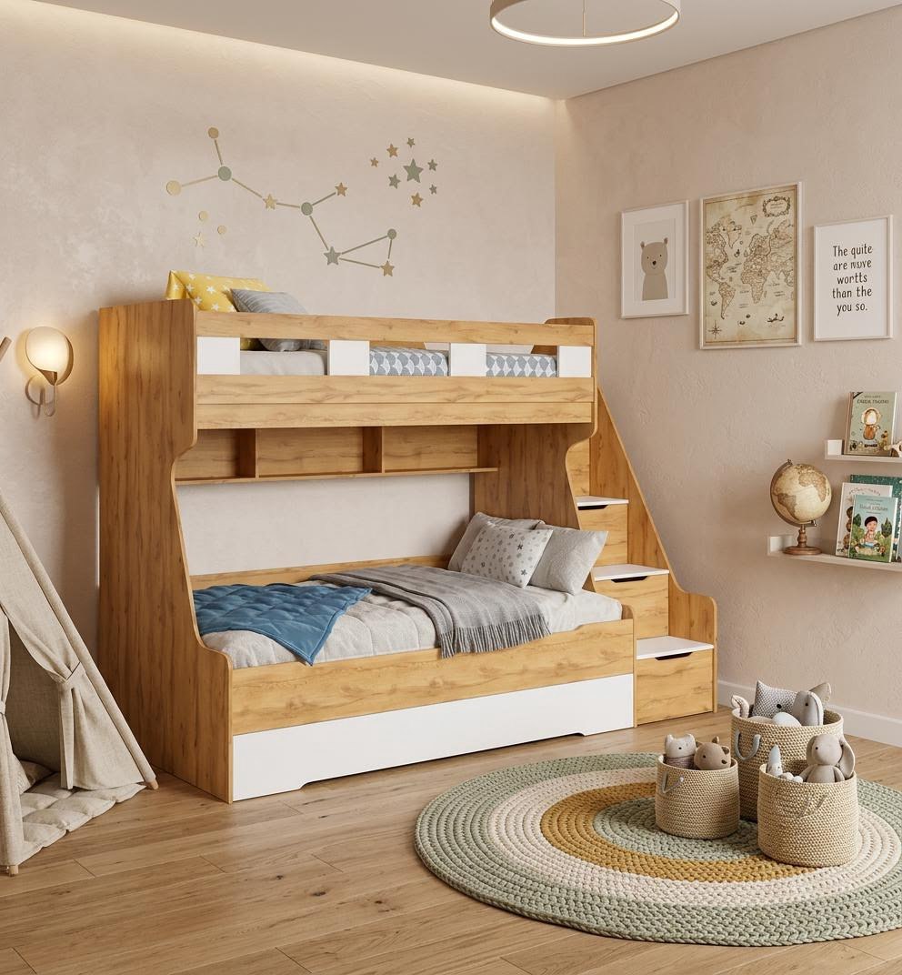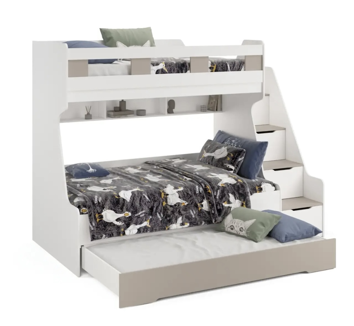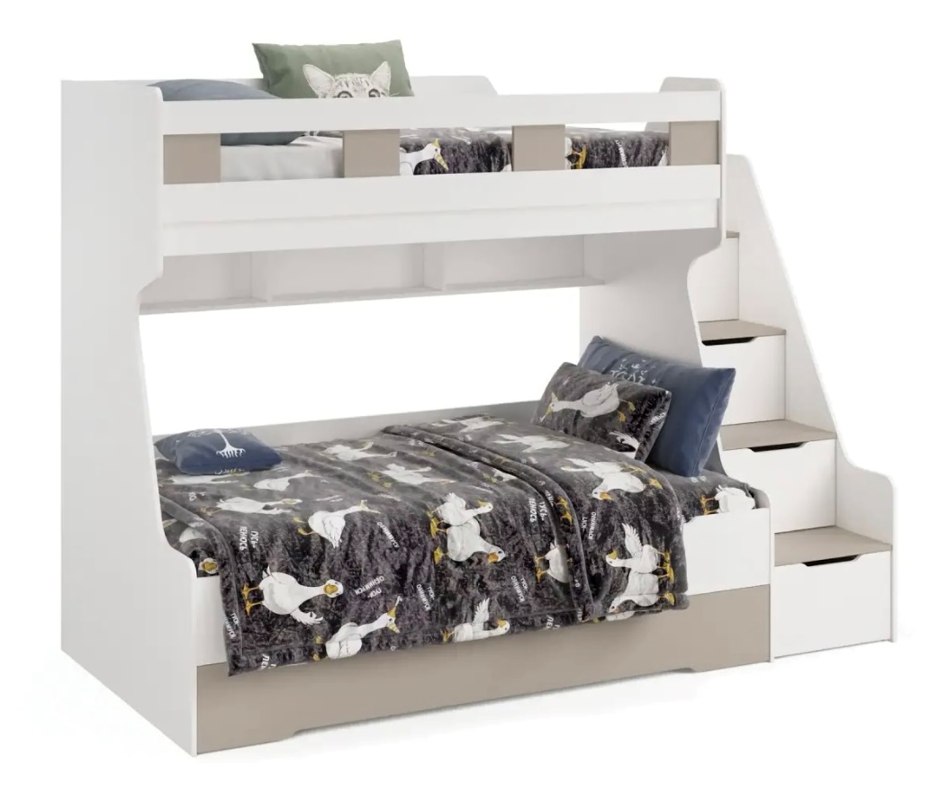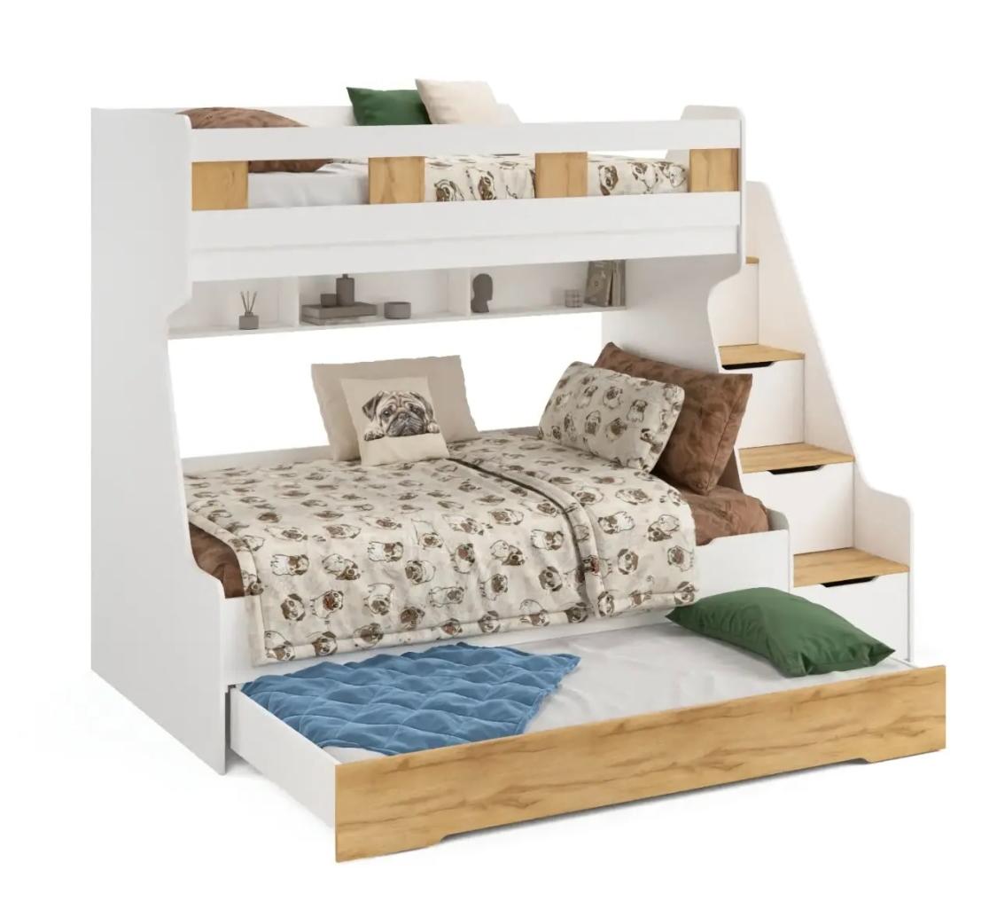 Высокая нагрузка на спальные места. Дополнительное выдвижное спальное место. Удобная лестница. Высокий, безопасный бортик. Прочные ящики! |