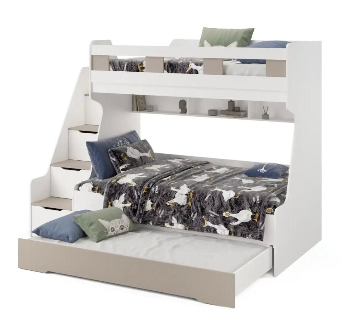 Высокая нагрузка на спальные места. Дополнительное выдвижное спальное место. Удобная лестница. Высокий, безопасный бортик. Прочные ящики!