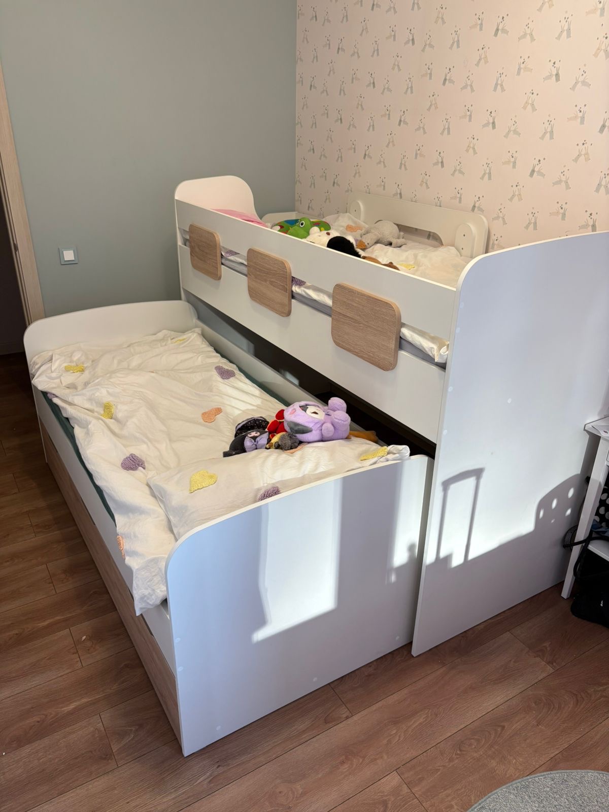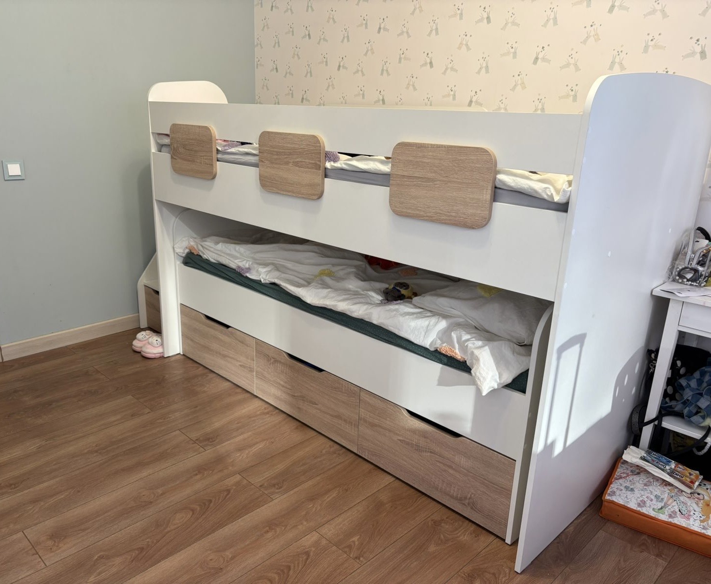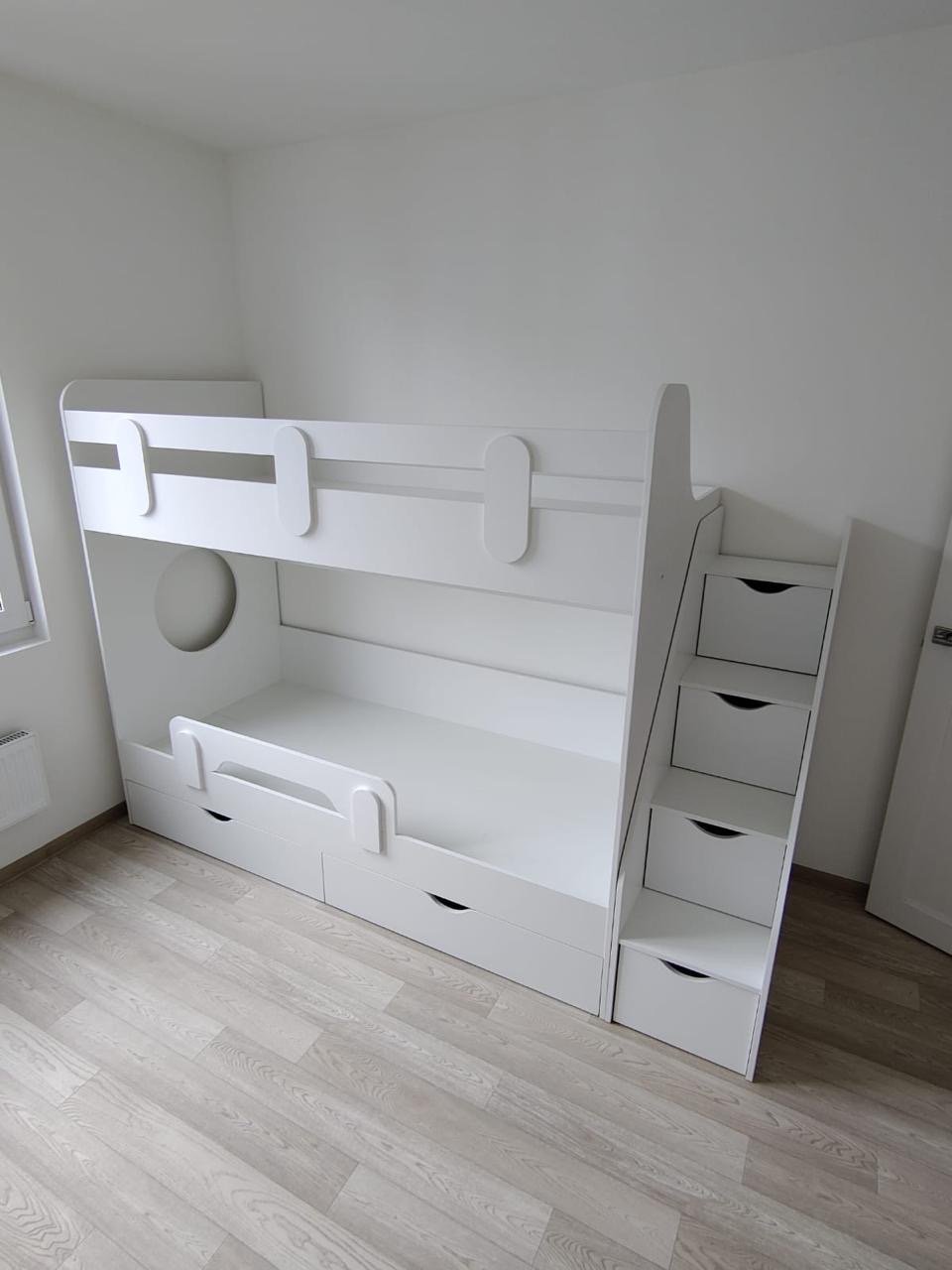 Здравствуйте! Долго искала именно невысокую выдвижную кровать с удобной лестницей. Спасибо вам за такую модель, ящики большие, все помещается.